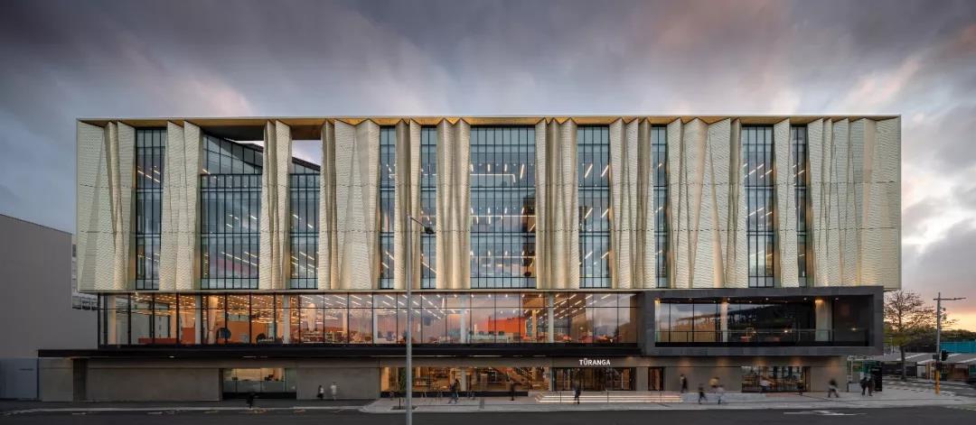 作為一種彰顯部落文化的象征,籠罩在建筑物醒目幾何立面外的金色面紗具有震撼的視覺效果,描繪出日落時分最后一縷陽光所帶來光澤的深度。面紗擺動的形態(tài)來源于圖書館上層望出去起伏的群山,以及當(dāng)?shù)?/span> harakeke 亞麻瘦長厚實的葉片,它是當(dāng)?shù)貍鹘y(tǒng)文化習(xí)俗中一種重要的自然元素。