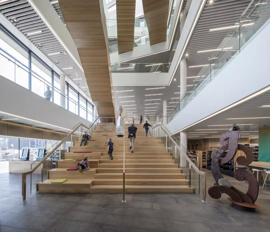 誕生于城市地震重建災(zāi)區(qū)中心的 Tūranga 圖書館在設(shè)計上重點關(guān)注結(jié)構(gòu)恢復(fù)力、空間功能性以及文化意識。作為九項城市災(zāi)后重建的重點項目之一,5層高、9500平方米的圖書館坐落于大教堂歷史廣場,旨在重構(gòu)城市公共空間。圖書館入口的設(shè)計寫著毛利語“whakamanuhiri” ,意思是盛情迎接來訪者。接待處的墻體上繪制了當(dāng)?shù)靥厣珓又参镞M(jìn)化史。