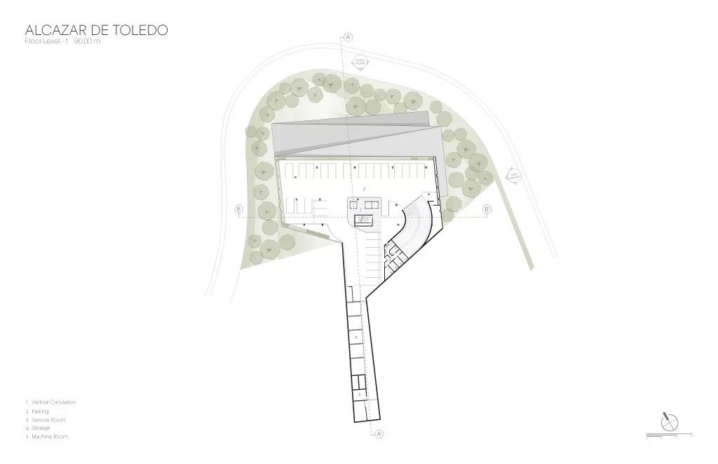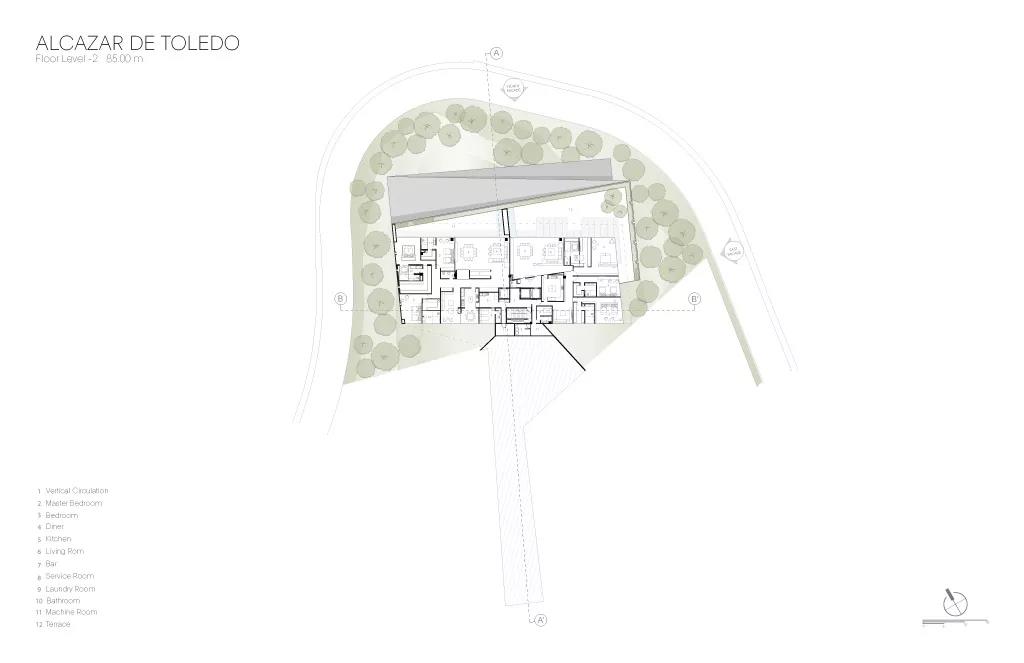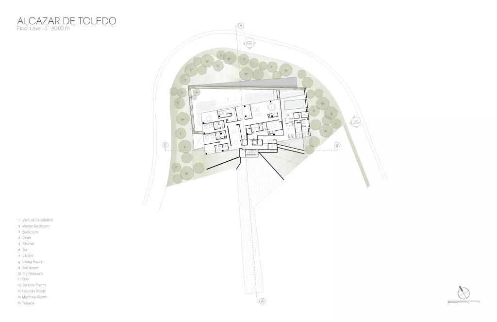 地形的自然坡度使得建筑的入口和排列呈一個下降的趨勢。車輛入口在最高點,通過一個坡道緩緩下降5米到達看上去被樹木環繞的接待區。該區域被一個有著噴泉的大水池限定,配有十個為訪客準備的停車位和通往居民停車場的坡道。門廳是一個透明玻璃盒,位于廣場中心,通往可以到達下面四層住戶的不同層的核心垂直交通。