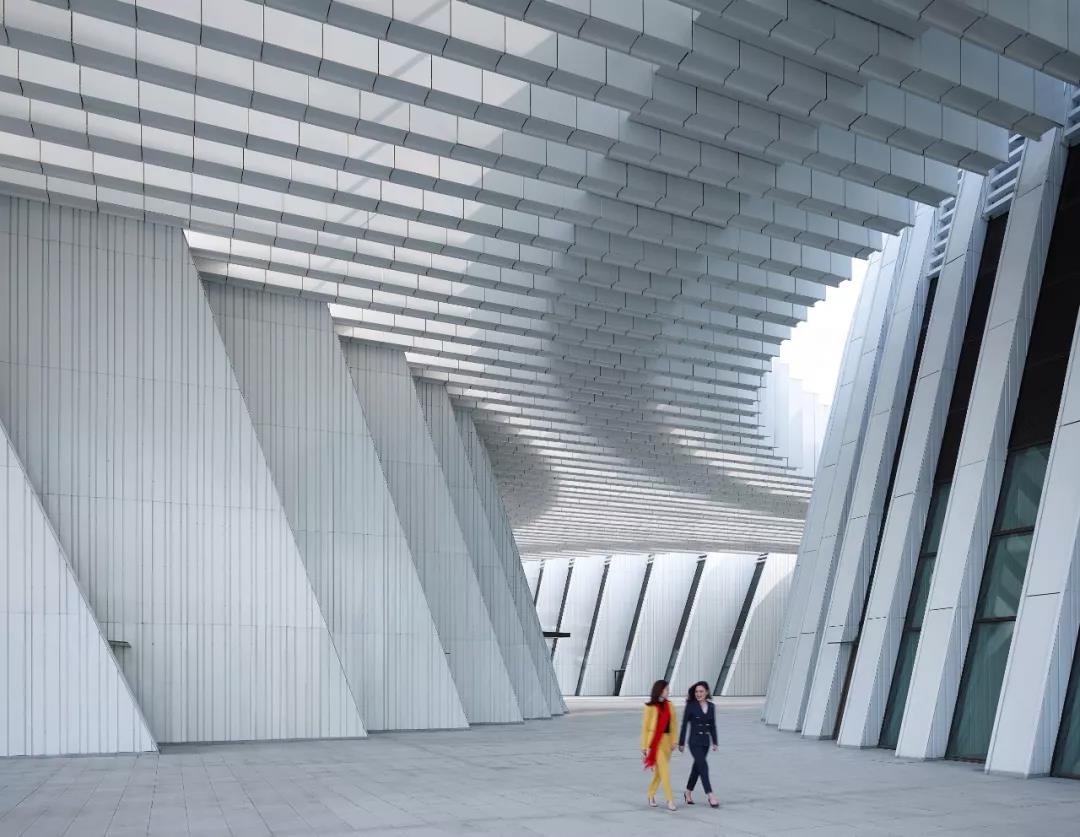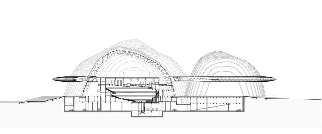 一座出挑的屋面將三座建筑單體覆蓋于其下。云朵般的屋頂和“山脈”,通過抽象的條紋方式拆解,被一個拱形結構分別承載。帶有精細折疊結構的白色薄鋁板包裹著這些承載元素的可見部分。當人們從劇院對面的大橋上駛向大劇院將會感受到建筑輪廓的俊逸優美,廣西文化藝術中心令人難忘的形式和高規格演出條件令其成為南寧乃至廣西重要的文化名片。