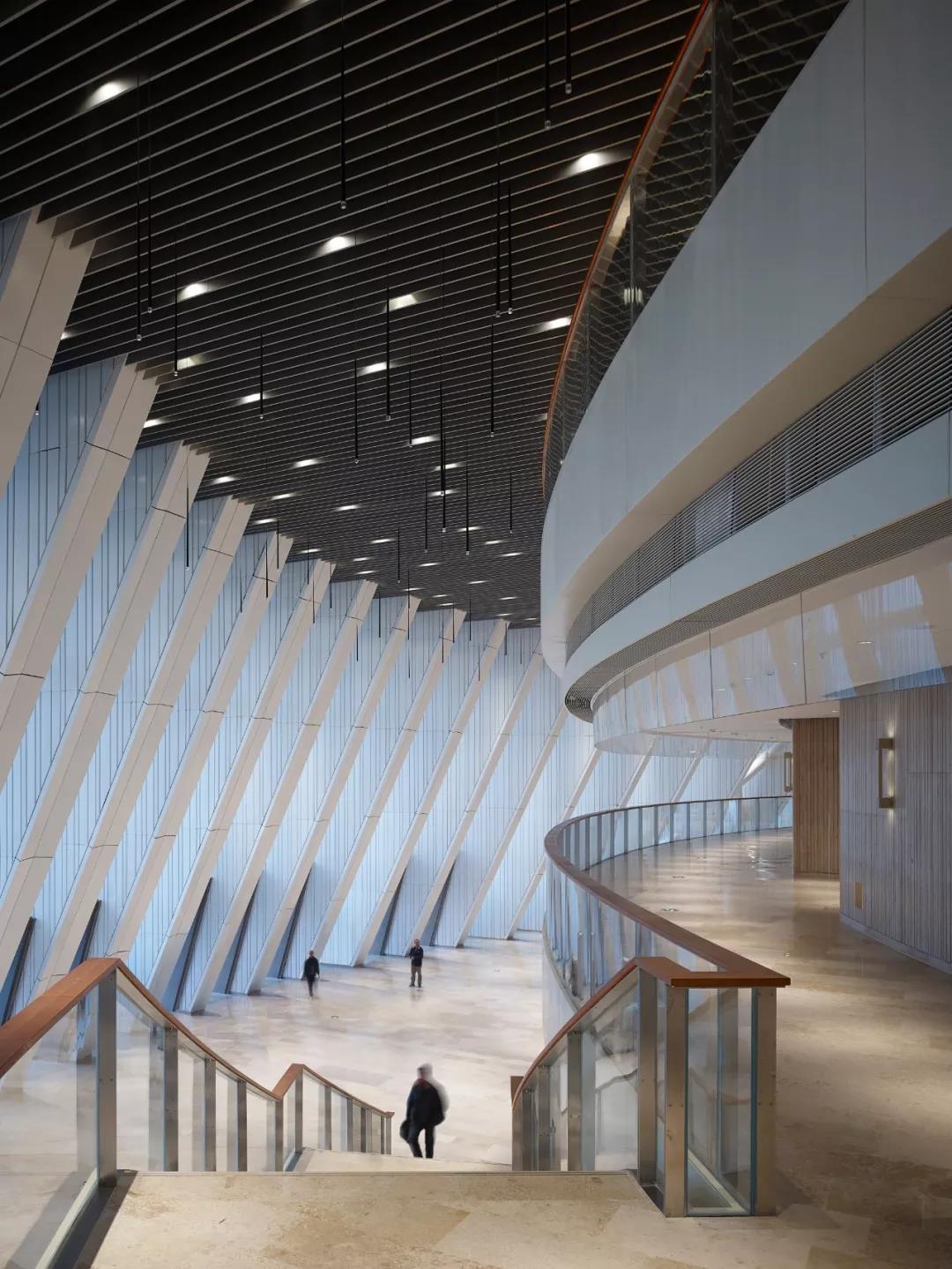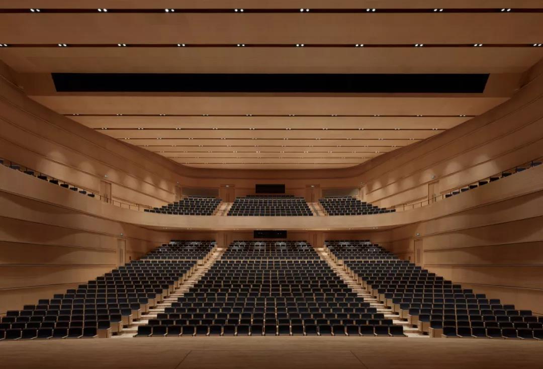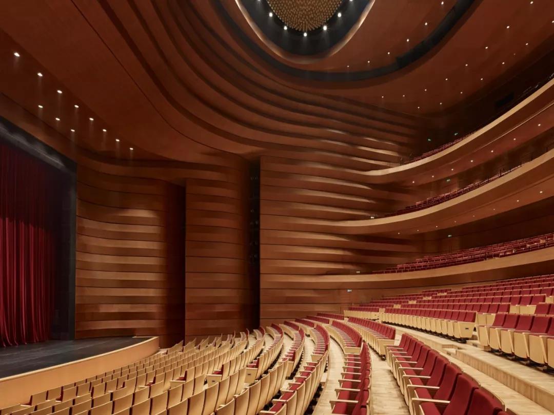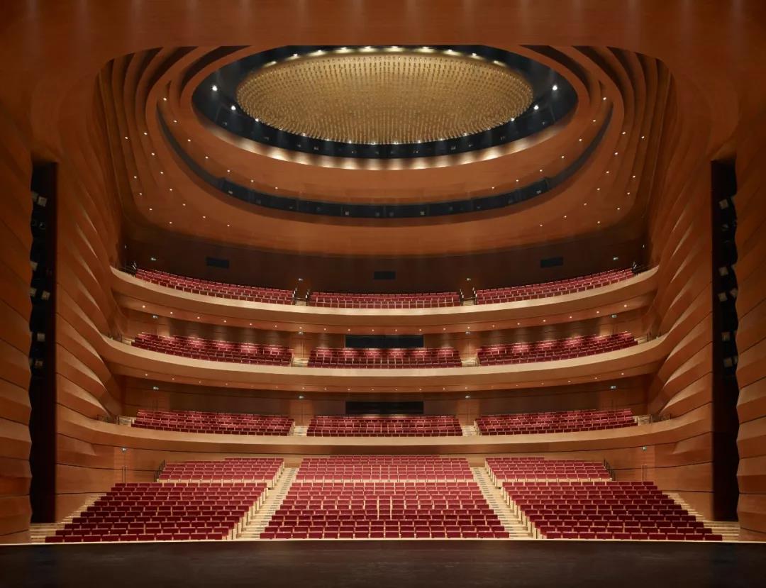 歌劇廳用木質墻板打造了內部空間的表皮,保證出色的空間聲學效果,混響時間在1.51.8秒之間,營造和諧完美的音樂感受和氛圍。