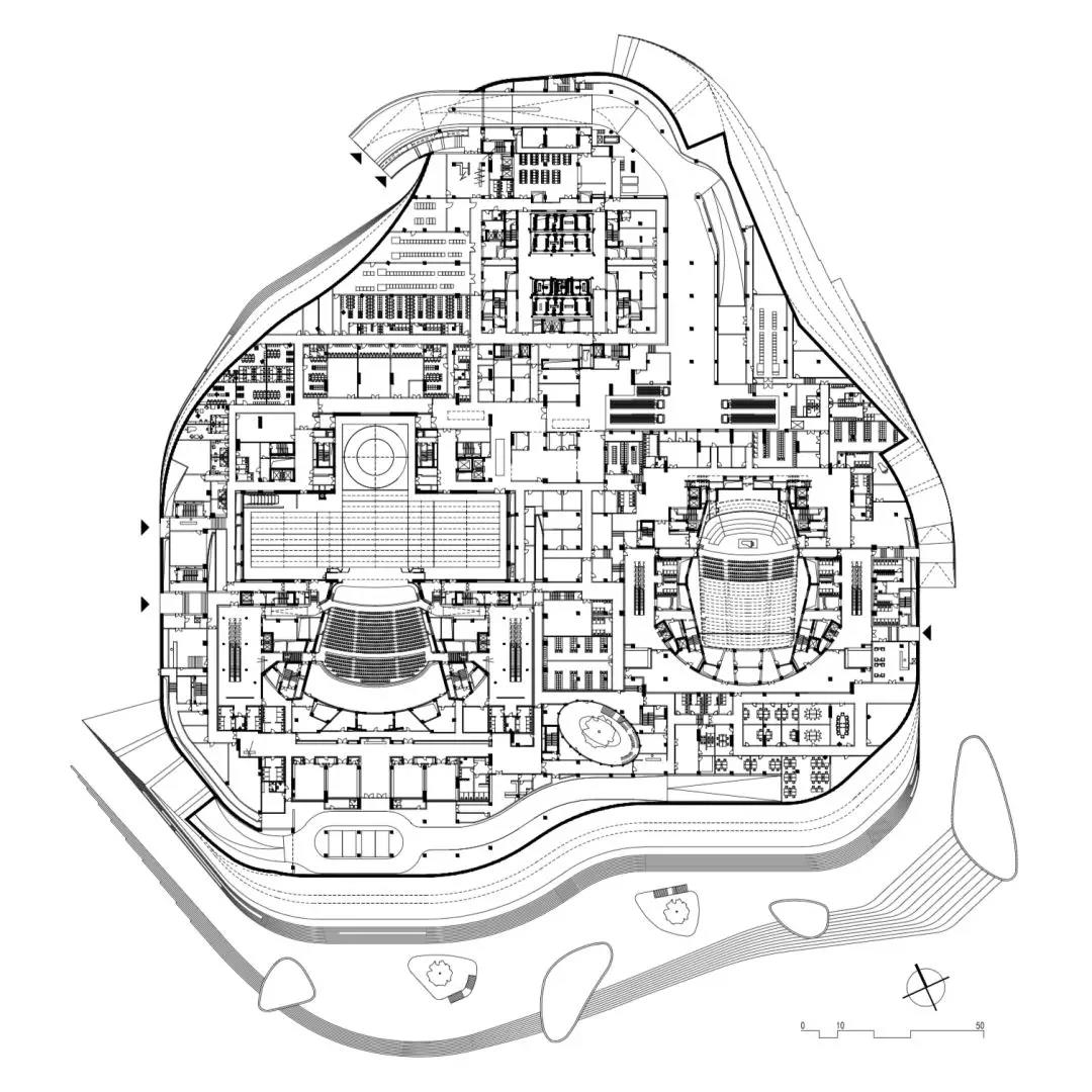 歌劇廳、音樂廳和多功能廳作為三個獨立的體量被置于一個淺色天然石材基座之上,基座內為輔助性功能空間。歌劇院位于西南端,內部設有1600個坐席,其內約600平方米舞臺面向人工湖面打開。歌劇廳內部位為古典的馬蹄形格局,三個樓座層經由一座大型樓梯和樓座前廳抵達。