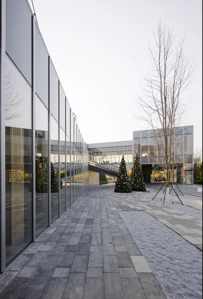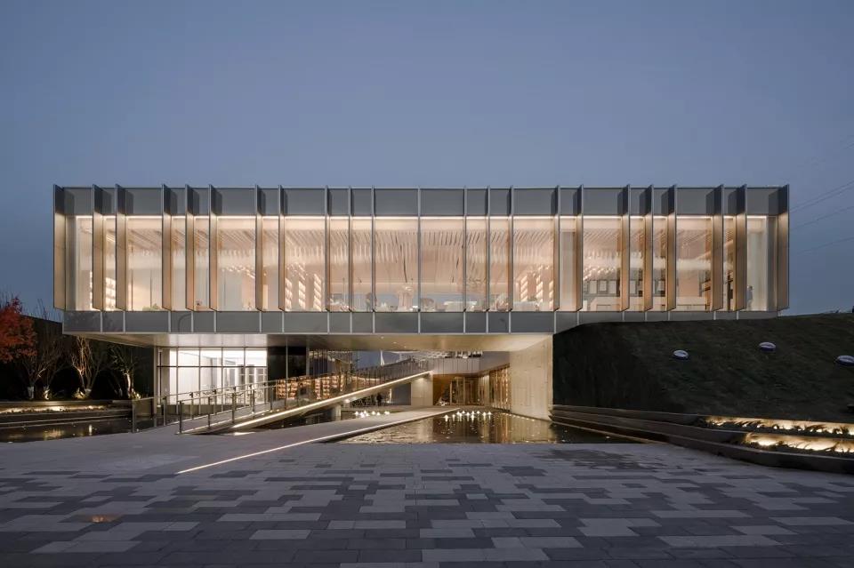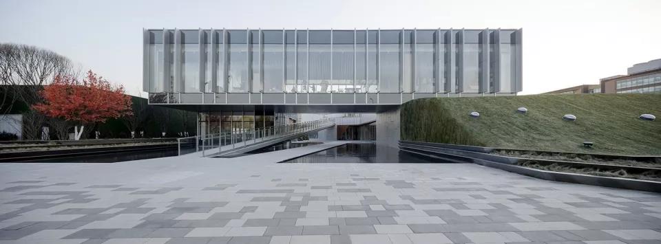 從基地南邊遠遠望去,銀灰色的建筑安靜地被置于草坡之上,方正的形體與漫反射鋁板的材質(zhì)形成戲劇化的體驗,使建筑似是輪廓分明,又似是與背景天空融為一體。沿著西側主入口的方向漸漸接近,建筑的面貌再次發(fā)生根本性的改變——從南側完全封閉的鋁板表皮,到西側完全通透的超白玻幕墻;從南側呈現(xiàn)自然狀態(tài)的綠草如茵的草坡,到西側大跨度的底層架空、人工設計感極強的水池和金屬坡道,仿佛建筑本身切割開了兩個風格全然不同的世界。