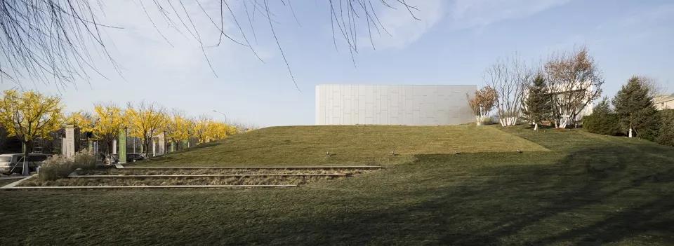 建筑位于草坡上,鋁板立面和環(huán)境相和諧