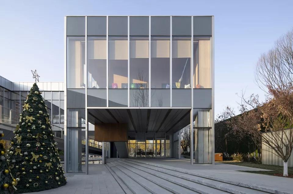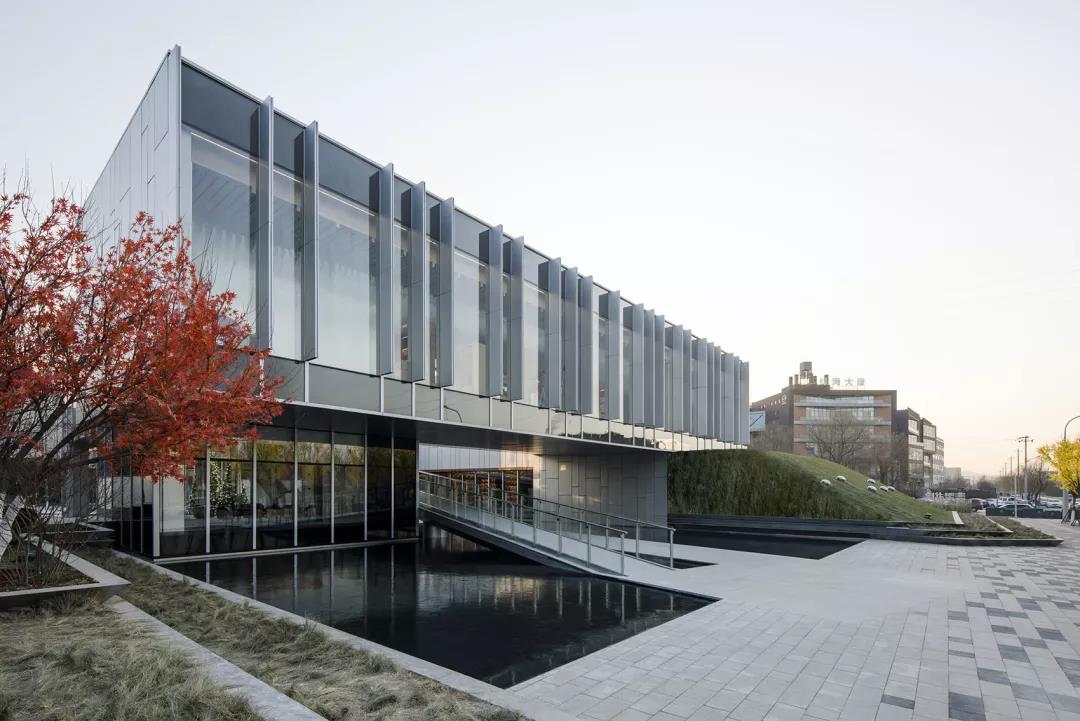 隨著一天中光線的變化,光相當于作為一種獨立的材質(zhì)參與到建筑中。鋁板隨著陽光的強度變化呈現(xiàn)出不同的色調(diào),玻璃的色調(diào)則是同時具備了天空的顏色和內(nèi)部的光照,平靜的水面再將建筑和天空一同納入其中,層疊反復的光影反射讓建筑的邊緣和界限模糊起來,也為建筑呈現(xiàn)出更豐富多變的面貌。夕陽西下時分,從二層平臺的花園向西望去,溫暖的余暉直透過兩層玻璃幕墻,如“框景”一般勾勒出西側公園景觀和遠方西山的輪廓,玻璃退讓為光線的畫布,室內(nèi)的場景與活動展示于畫布之上,上演了有趣的看與被看的空間敘事關系。