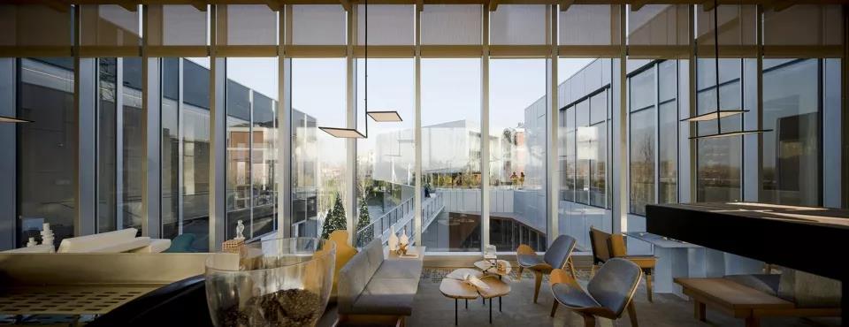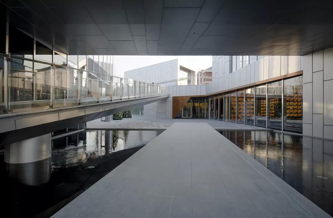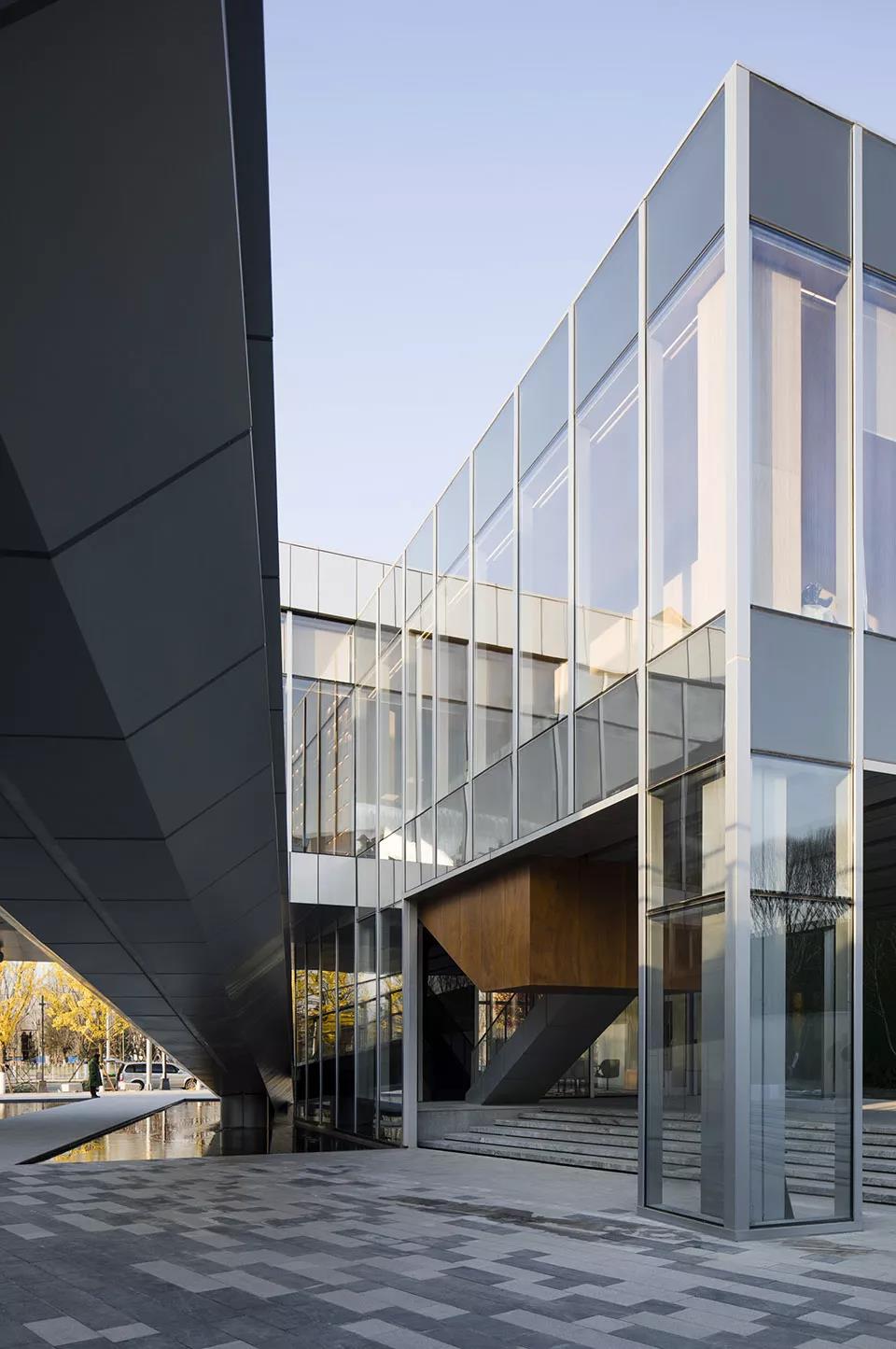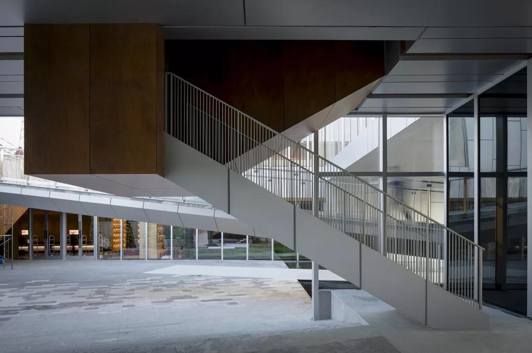 如果說建筑自身風格與形式方面的“自由”只是詮釋了自由的一個方面,那么建筑師在設計中無疑試圖表達了更多。建筑主體方正、沉穩(wěn)的體量與西側那一條充滿力量感和動感的坡道的組合,庭院里幾何分割棱角分明的臺階、水景與延續(xù)了南側整個立面自然態(tài)的草坡的對比和融合,作為主材質(zhì)的玻璃和鋁板清冷、堅硬的質(zhì)感對多處點綴的Parklex木紋板溫暖而親近自然的柔和感的襯托,無一不在喻示著本身的矛盾性和復雜性。正如羅伯特·文丘里所說,現(xiàn)代建筑往往是以犧牲多樣而復雜的東西為代價,來將建筑中原始而基本的東西理想化,因此在面對更復雜、變化更快的世界時會變得軟弱而無力。而能深刻有力地滿足人們心靈需求的美,都是來自內(nèi)在的復雜性。