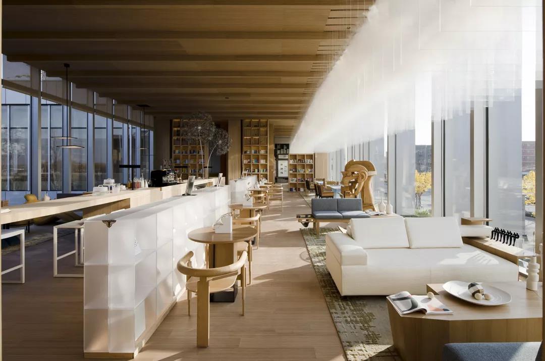 不同的流線提供了多種多樣的可能性,也帶來了多種多樣的空間感受。站在建筑正前方的廣場上,既可以選擇穿過水池直接走進折線形雨蓬下的接待主入口,也可以選擇沿坡道徐徐向上體驗空中花園的感受;從二層的圖書館出來,既可以穿過花園體驗上層的樣板房,也可以走下曲徑通幽的景觀樓梯到達下沉的庭院。建筑師致力于賦予“人”的活動更多的可能,讓使用者在建筑中充分發(fā)揮主觀能動性。在建筑的功能與使用方式日趨復雜和多元化的現(xiàn)在,建筑師不應以掌控者自居,而應將更多的可能性讓渡給實際使用者,人的使用活動才是空間的靈魂。