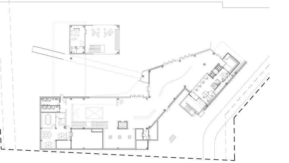 除了建筑自身的“自由”之外,建筑師希望建筑對于城市環(huán)境的關系也同樣是“自由”的,因此在西側主入口打造了一個完全開敞的、可穿過的底層架空空間,而在場地內(nèi)部營造了界限模糊的“院落”。建筑師認為,“院落”的界定不應拘泥于固定的格式,因此嘗試了以一條半懸空的坡道對內(nèi)外庭院進行模糊劃分,從空間的曖昧關系上繼續(xù)呼應“自由”的設計理念。