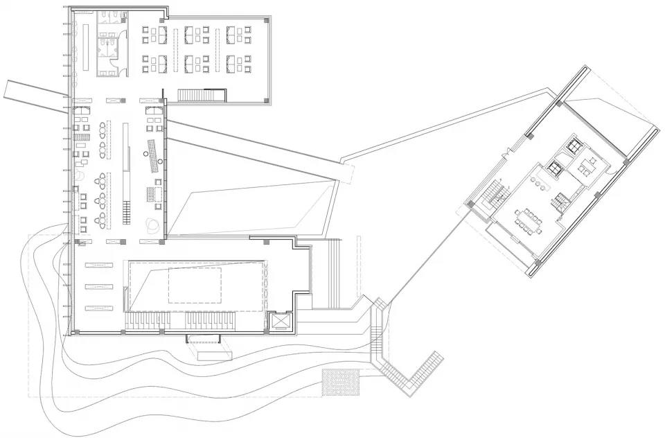 從建筑正面看去,輕盈而閃耀著金屬光澤的坡道宛如懸浮,與水池之上的道路在平面投影上呈現(xiàn)互相平行的關系。這樣的關系喻示著兩者在流線方面高度的并列性,并不刻意強化其中一種,而更多地突出并存的“可能性”。這兩條通路通過建筑內(nèi)部的流線融合在一起,形成一個完整的環(huán)線,這即是建筑中主要的流線組織方式,更少強調(diào)“順序”“方向性”,更注重不同區(qū)域間流線相互的融合與串聯(lián)。