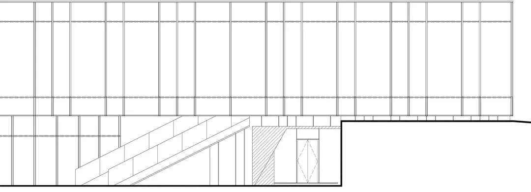 因此,建筑師遵循“意義的簡明”不如“意義的豐富”的思考,將建筑的設計拆解為每一個場景的設計,而拒絕將其風格形制進行簡單的概括統(tǒng)一。比如在入口雨蓬處就大膽應用了不規(guī)則折線形木紋板,作為入口空間上強有力的對景元素;建筑南側延續(xù)了旁邊的公共綠地,首層大部分埋于草坡之下,并且巧妙地隱藏了一個小巧精致、自然氣息濃郁的庭院,與北側清晰明了的空間關系形成了鮮明的對比。