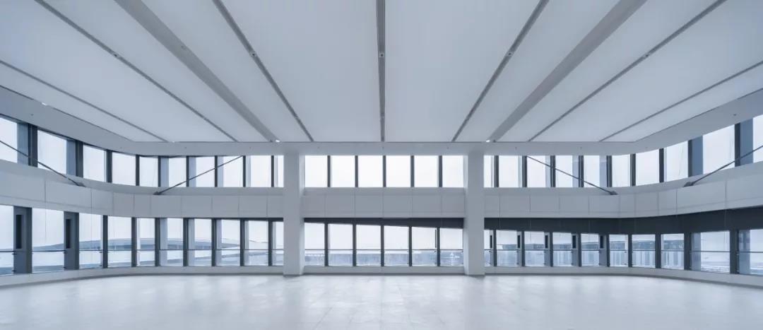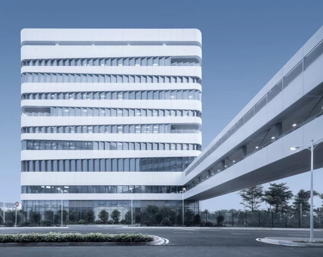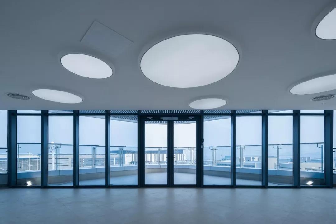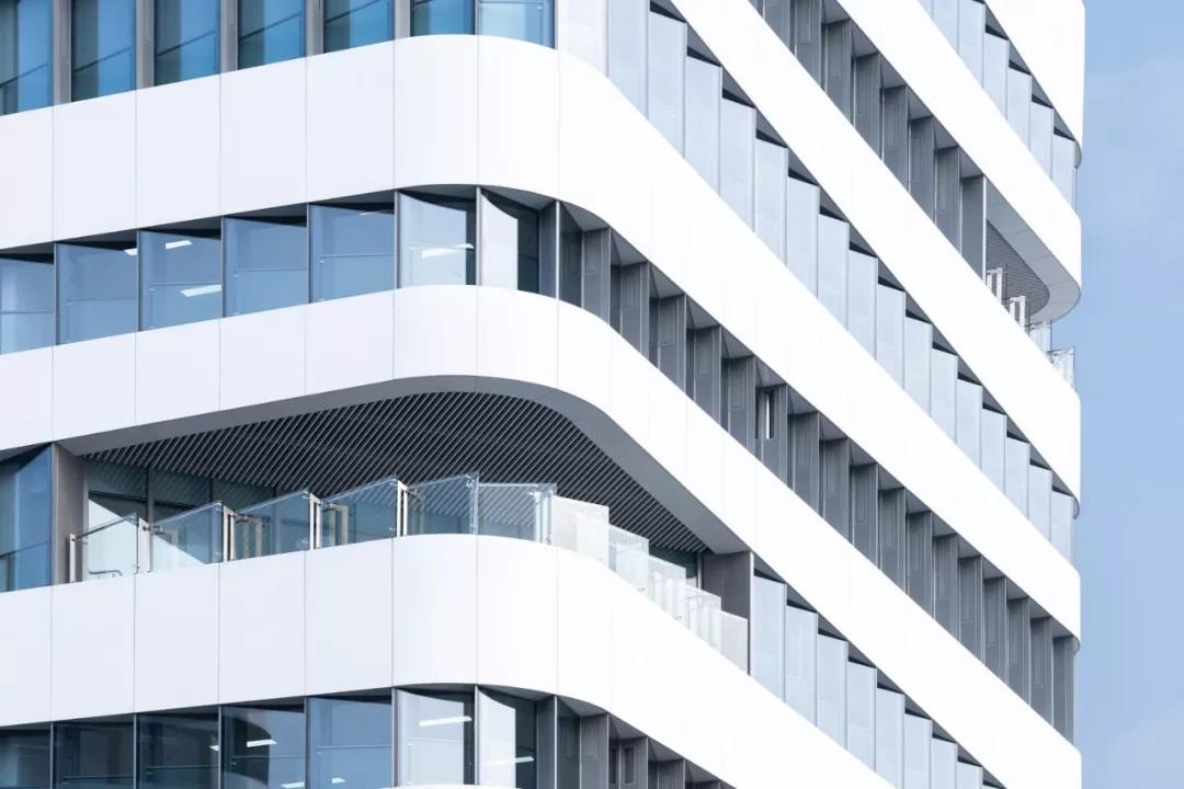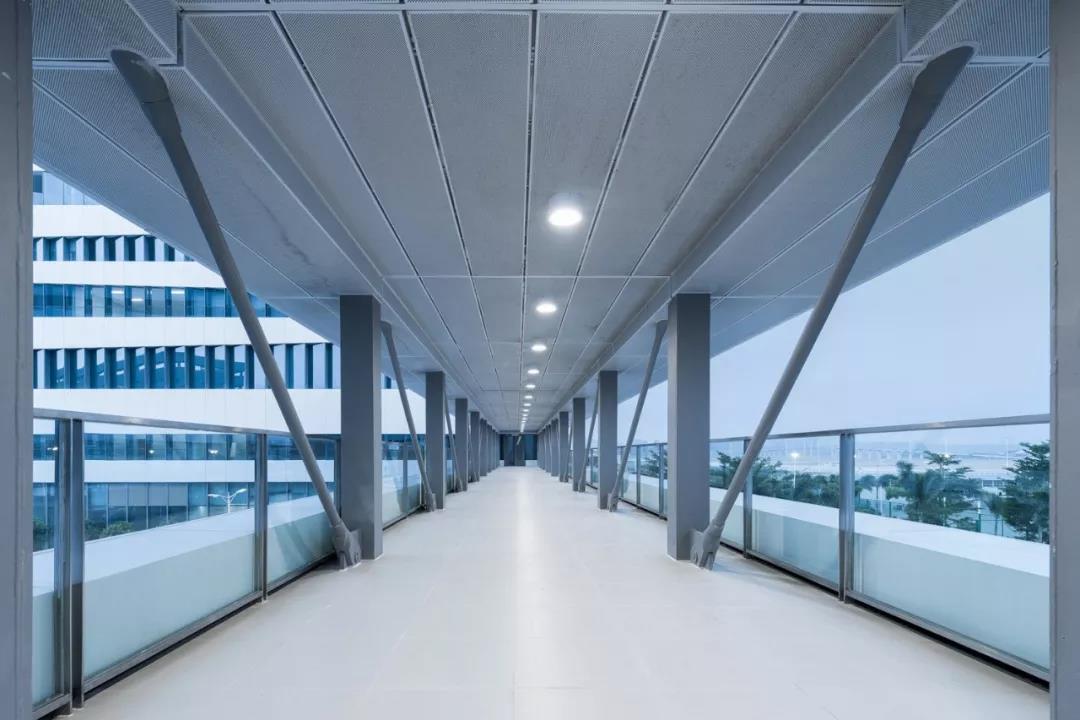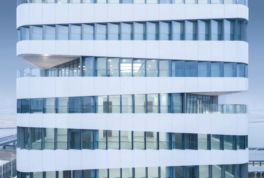 四棟高層建筑的角部被處理成圓弧形,去除角柱,設置內凹轉角陽臺,并逐層錯位盤旋而上,造型變得豐富有趣。辦公樓的標準層也因為有了轉角陽臺,從而能夠從半室外空間鳥瞰周邊的海景、人工島、以及港珠澳大橋的雄姿,提升了人性化的辦公品質。