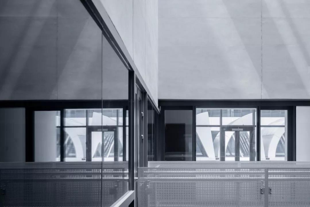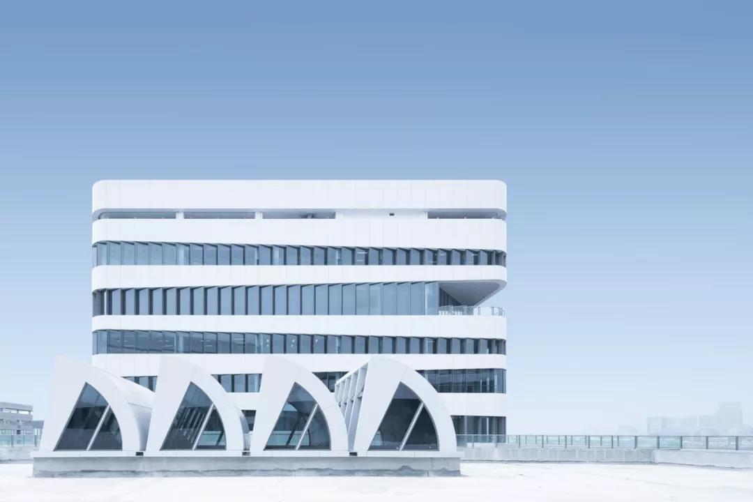 在塔樓立面上,我們以鏡像的主題來設計虛實的對比。藍天碧水之間,白色鋁板,藍灰色玻璃,兩種表皮此起彼伏;上下層鋸齒窗順時針與逆時針變換排列方向,產生交錯的光影,這一切塑造了海波蕩漾的戲劇化構圖。在鋸齒窗的設計中,正面的玻璃板塊確保了立面的純凈,側面的鋁板部分作為開啟部件,確保了自然通風的可行。