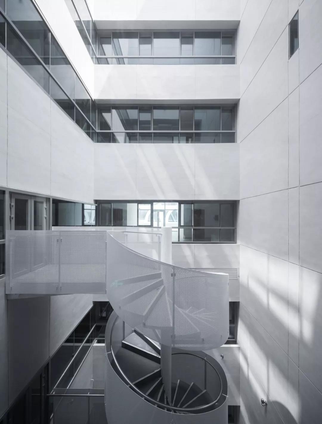 在每棟辦公塔樓當中,我們設計了一個約8米見方的拔風天井,豎向交通分置天井兩邊,電梯廳與天井內的旋轉樓梯連通,一方面讓辦公室的空氣得以流通,另一方面讓辦公樓空間趣意盎然,清涼的設計也使得口岸辦公樓在華南地區更接地氣。