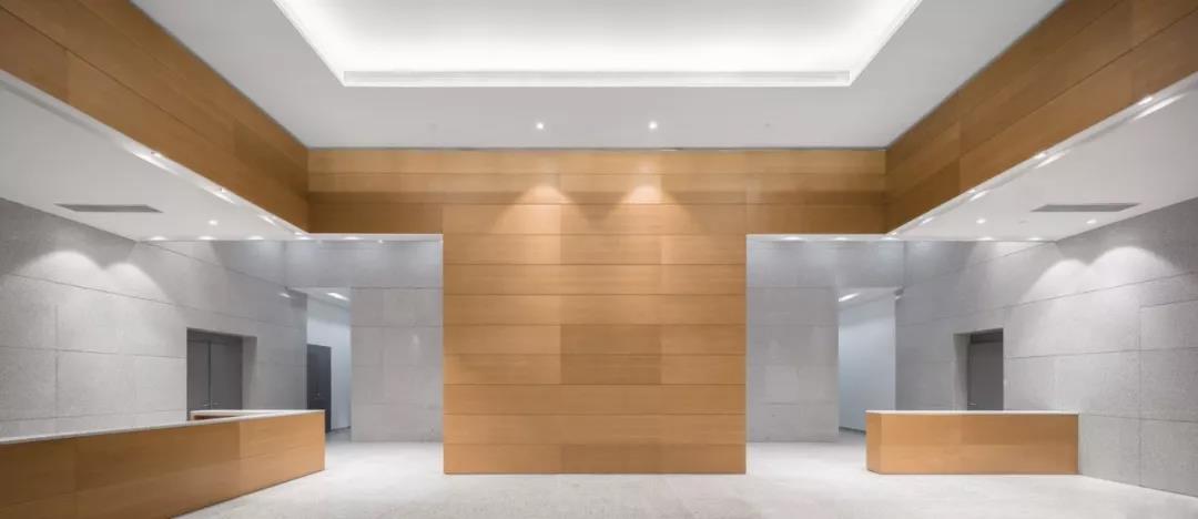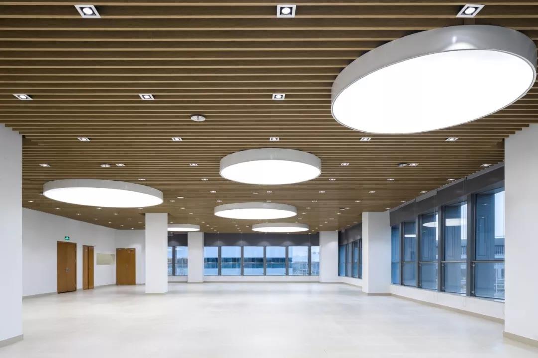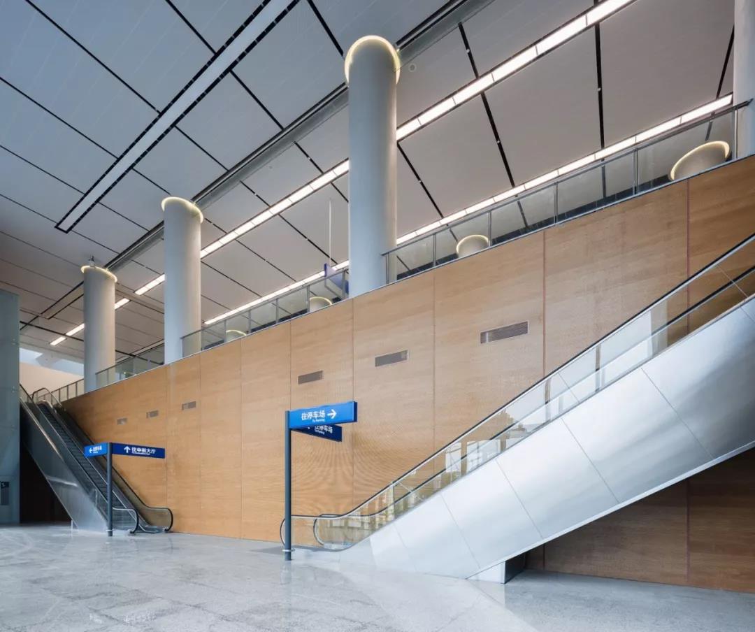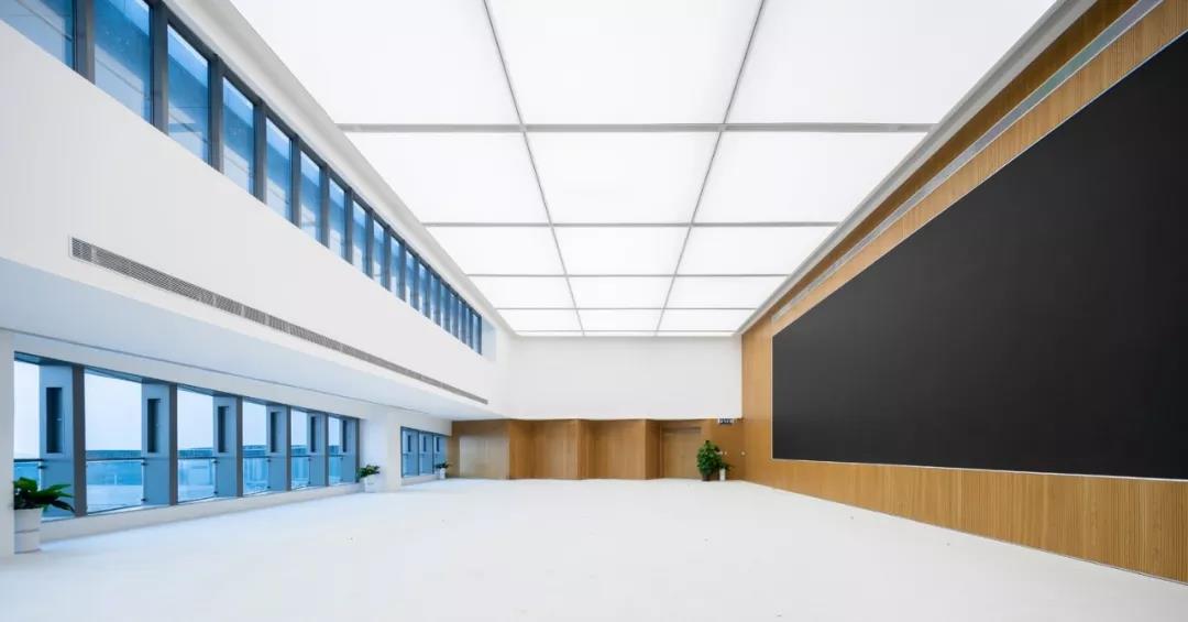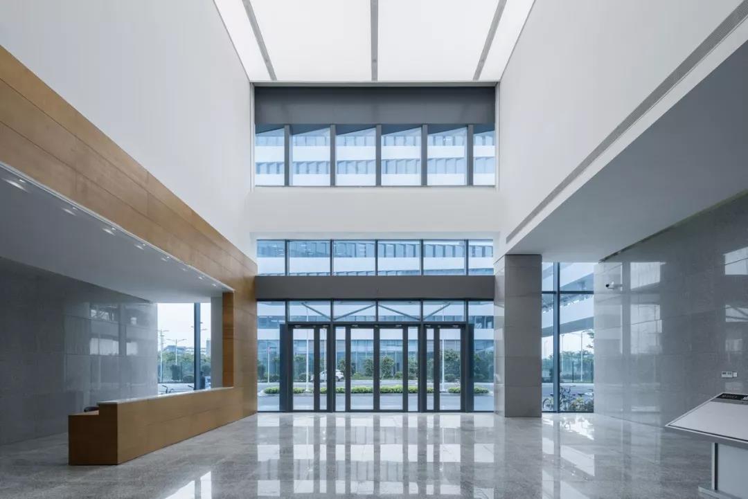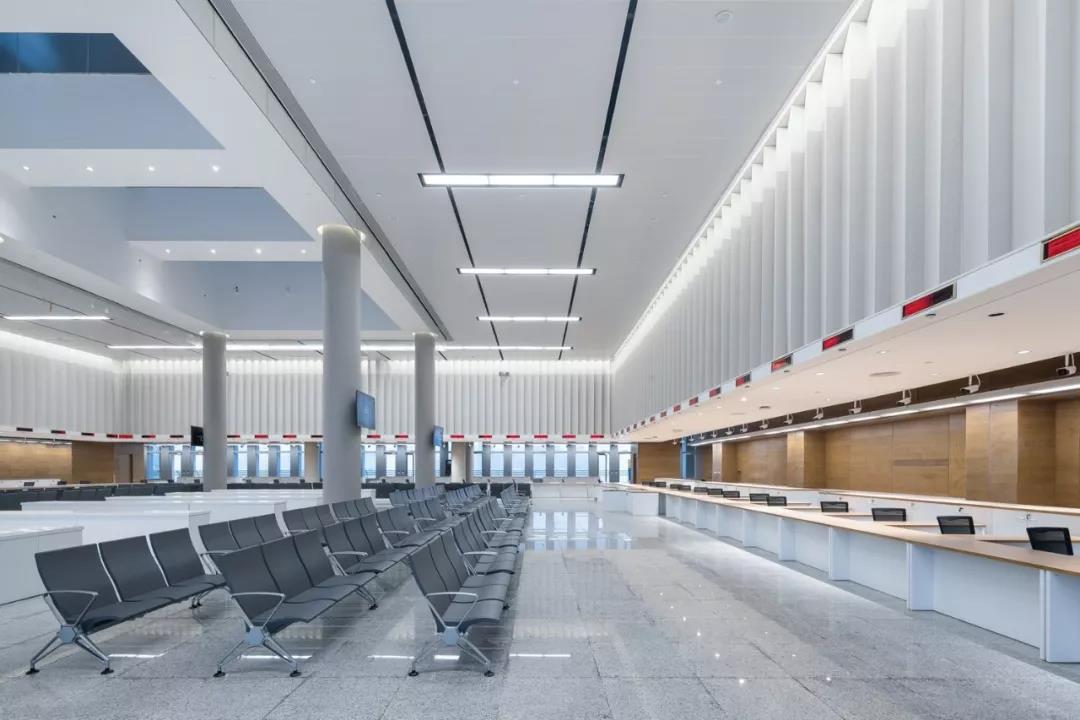在口岸辦公區的室內設計中,位于裙房的非現場綜合報關報檢廳成為了表現的重點,大廳凈高7m,屋面采用大跨度預應力鋼混框架結構。大廳的吊頂采用穿孔鋁合金吸音板,居中位置布置帆型天窗,組織豎向通風,避免直射眩光。結合非現場申報的工藝流程,我們將申報辦公區與公眾等候區做了不同的凈高處理,分界處的高差采用下掛式穿孔鋁板帷幕遮擋,帷幕的設計再次呼應了鋸齒形單元窗的設計母題,整個大廳空間流暢舒展,明快雅致。