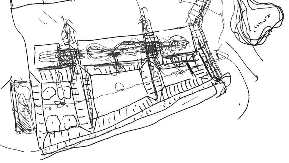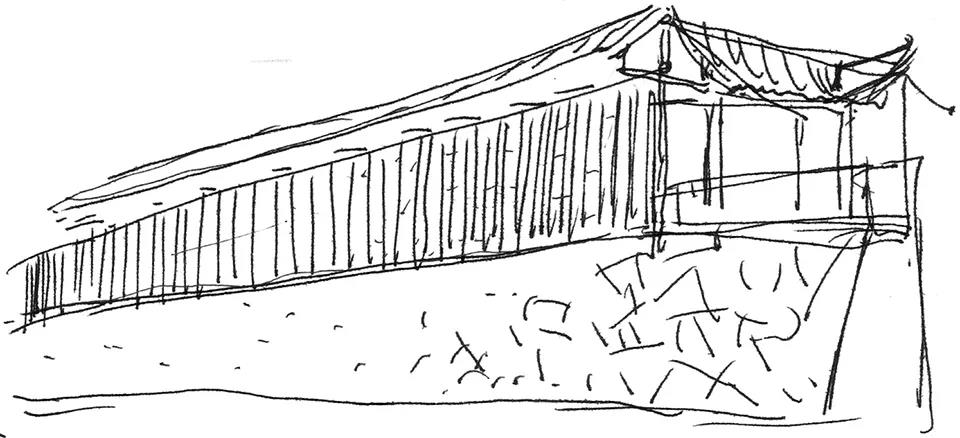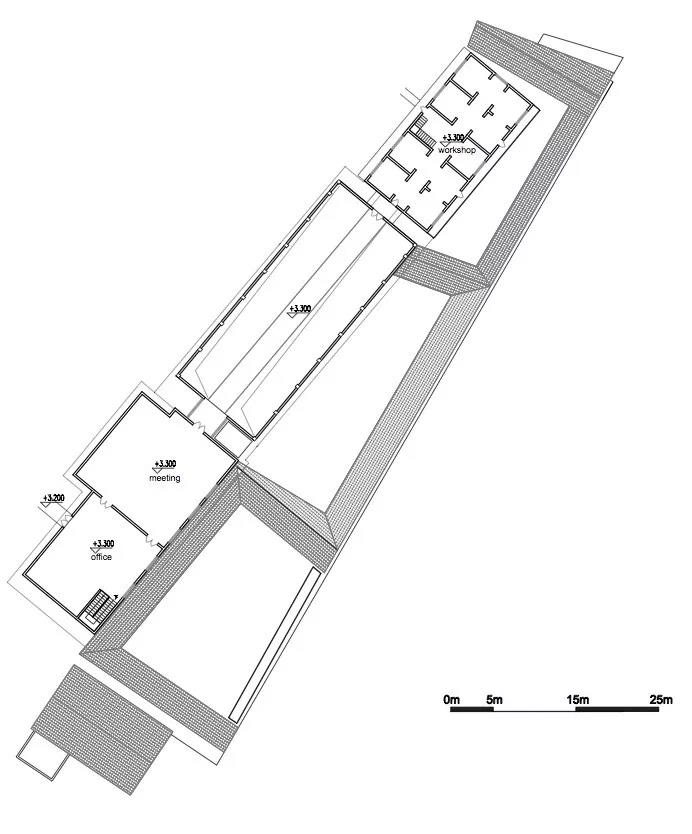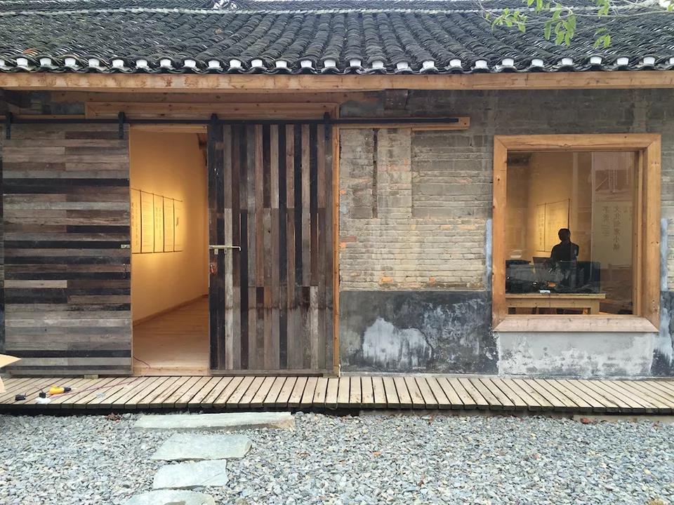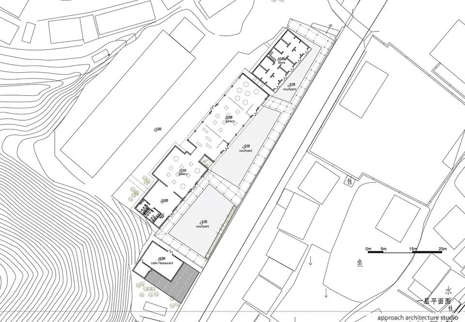 外部采用當地傳統做法及材料,圍合建造一條分隔喧鬧的公路與安靜的展覽廳之間的廊道,將現有室外空間劃為三個大小、形狀、使用目地不同的院落。