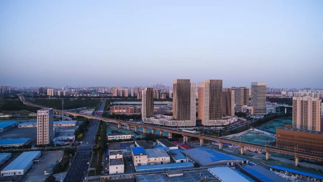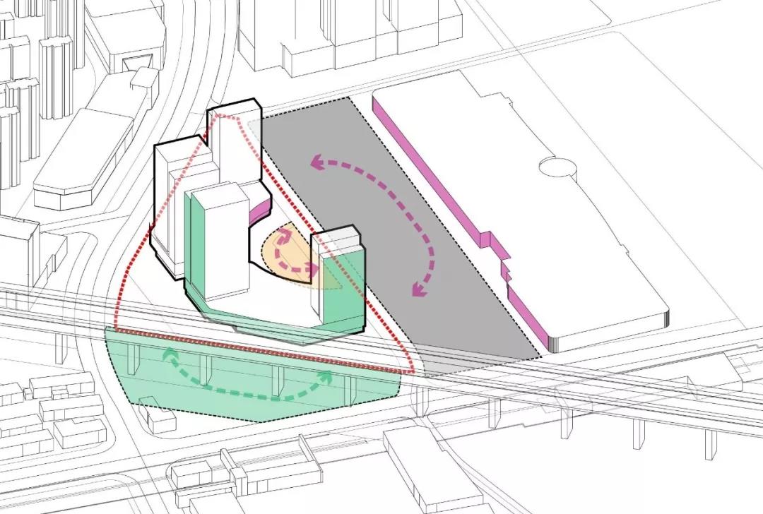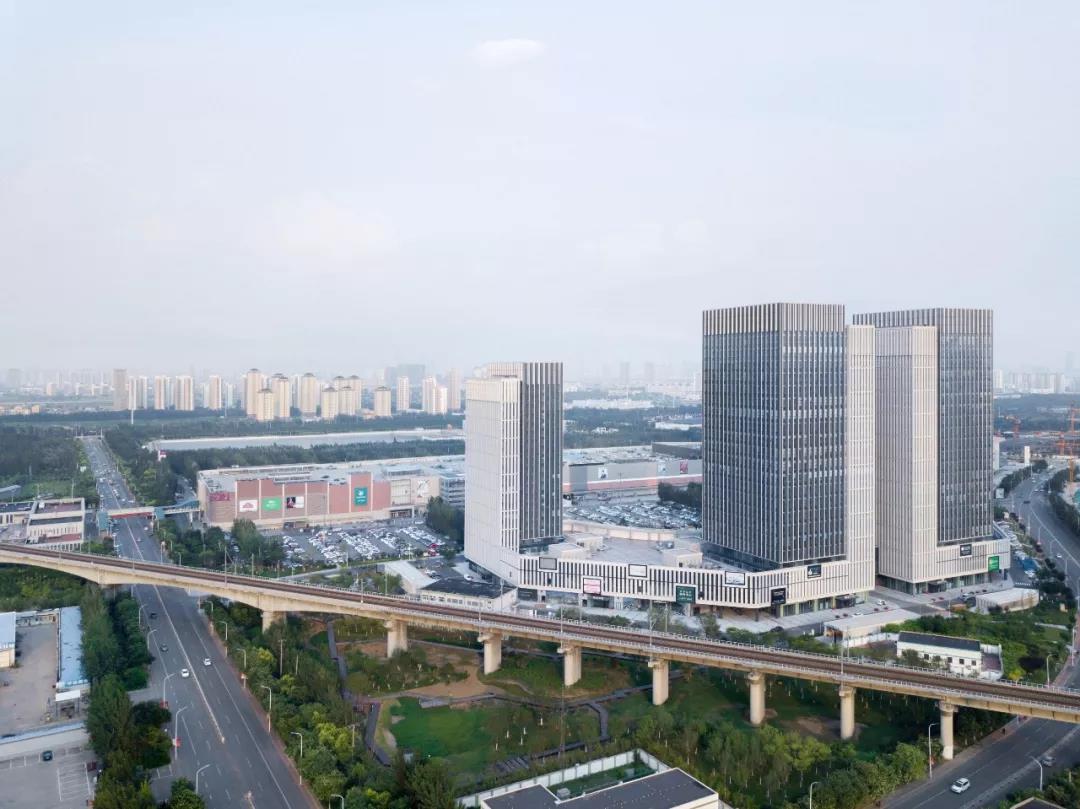 項(xiàng)目距離外環(huán)線500米綠化帶340米,距離南運(yùn)河華僑城水街800米。東側(cè)有寬廣的停車(chē)場(chǎng),北側(cè)京滬高鐵高架從地塊邊界通過(guò),高架下已建成一處棧道公園。項(xiàng)目東側(cè)與停車(chē)場(chǎng)之間退讓出一個(gè)半圓形廣場(chǎng),在建筑體量圍合之中,成為本區(qū)域最大的開(kāi)放空間,容納多種商業(yè)活動(dòng)和市民文化生活。項(xiàng)目北側(cè)建筑立面,具有棧道公園綠地景觀。