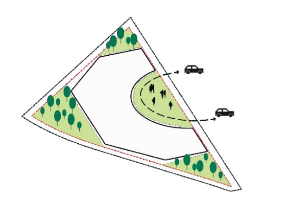 為了減少對(duì)基地對(duì)周邊交通的影響,適當(dāng)設(shè)置基地的出入口,最小化出入口的數(shù)量。首先在基地東側(cè)設(shè)置規(guī)劃道路,溝通阜盛道和萬(wàn)卉道,將主要入口置于規(guī)劃道路上,以此減少在城市干道上的開(kāi)口。此外于基地西北側(cè)沿高鐵綠化帶設(shè)置車(chē)行路溝通萬(wàn)卉道和規(guī)劃道路,并于建筑主體西南轉(zhuǎn)角處向萬(wàn)卉道開(kāi)設(shè)出入口。如此,形成萬(wàn)卉道上3個(gè)、阜盛道上1個(gè)共4個(gè)面向城市主干道的主要出入口。