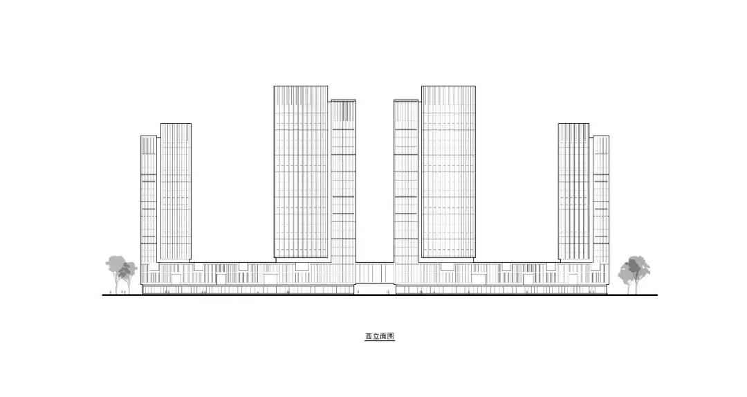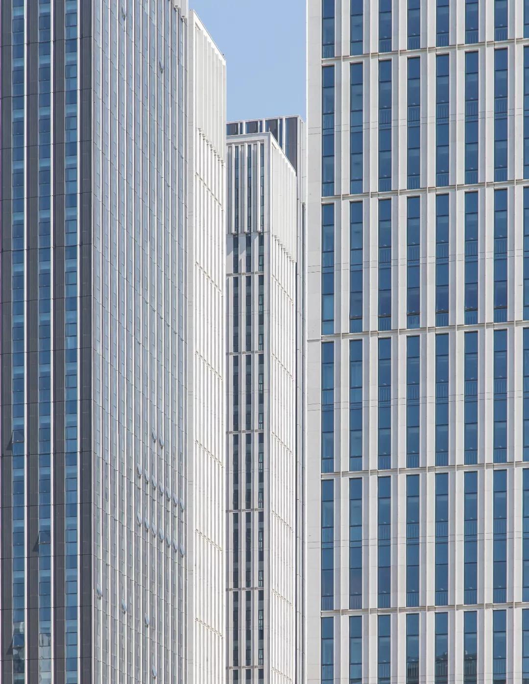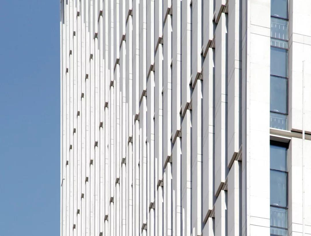 原本的建筑塔樓體量較敦實(shí),設(shè)計(jì)師在新城市中心使用了玻璃幕墻,調(diào)整了整個(gè)百葉窗的位置和間距,通過(guò)增加鋁板大百葉窗,使得整個(gè)主體幕墻和實(shí)墻之間的比例擴(kuò)大,產(chǎn)生一種明顯的虛實(shí)對(duì)比效果,從視覺(jué)上優(yōu)化了建筑的視覺(jué)效果,從視覺(jué)上將建筑分為兩個(gè)體塊,重新組合出了輕盈的體量關(guān)系,這種強(qiáng)烈的虛實(shí)變化使得建筑顯得高挑挺拔,整體感更加強(qiáng)烈、鮮明,玻璃立面使得商業(yè)裙房的商業(yè)價(jià)值最大化,同時(shí)和商業(yè)裙房連接為一個(gè)有機(jī)的整體。