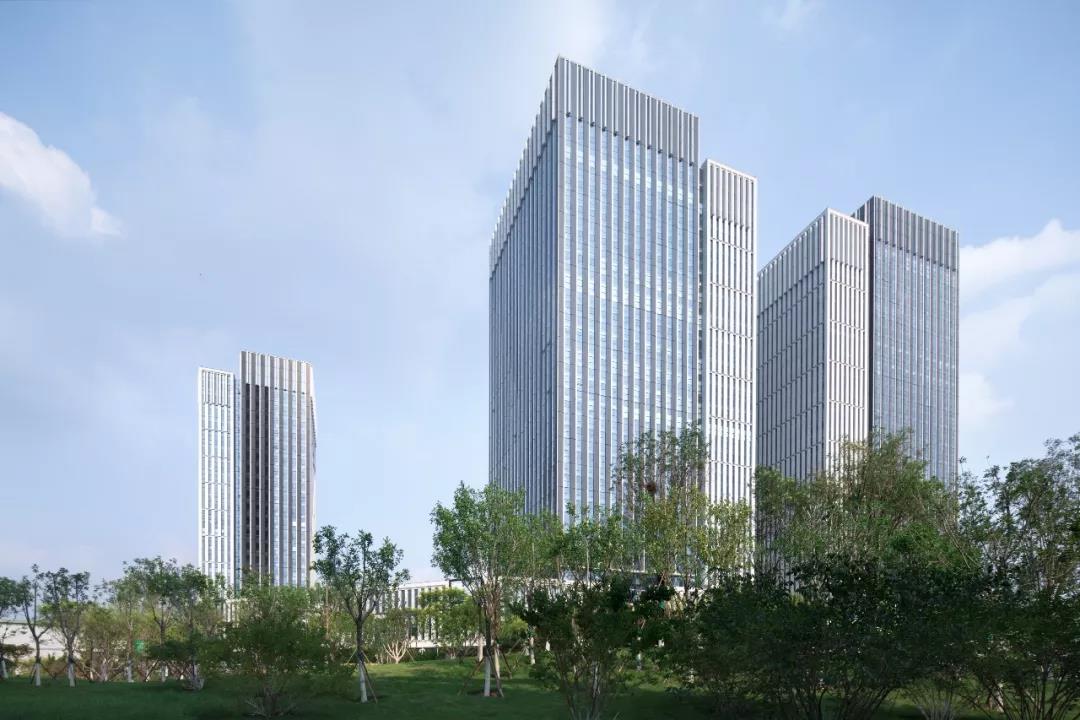 建筑師在建造前需要充分的考慮與周邊環(huán)境、建筑群的共融共生,實(shí)現(xiàn)整體的統(tǒng)一觀感,在此基礎(chǔ)上充分考慮環(huán)保節(jié)能。為充分利用基地面積,將地塊角落部分隔出用作綠化及停車(chē)空間,在中心位置的2棟高檔高層辦公建筑,使其形成標(biāo)志性的雙塔形狀,配合兩端2棟稍矮辦公建筑作為輔助,圍合成一個(gè)由裙房屋頂綠化,半圓形廣場(chǎng)組成的綠意融融的空間,并使得4棟塔樓保持適當(dāng)?shù)拈g距距離而避免過(guò)于擁擠。