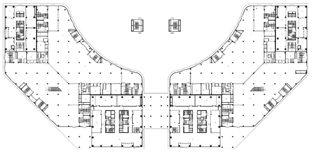 脫離“同質(zhì)化”后的新城市中心,恰當(dāng)?shù)嘏c周邊相融,內(nèi)與外的相互滲透,動(dòng)與靜的相互依存,形成了事物間平衡狀態(tài),成為城市建設(shè)的新地標(biāo)。現(xiàn)代辦公空間的拿捏不僅僅要做到標(biāo)準(zhǔn)化的辦公空間,更要脫離標(biāo)準(zhǔn),與周邊的環(huán)境相契合,融入到周邊的建筑群里。建筑的平面外輪廓與場(chǎng)地的用地邊界、走向形成的對(duì)應(yīng)或者幾何關(guān)系,彌補(bǔ)了建筑之外空閑場(chǎng)地?zé)o用的缺點(diǎn),保證了空間的整體和諧與完整統(tǒng)一。