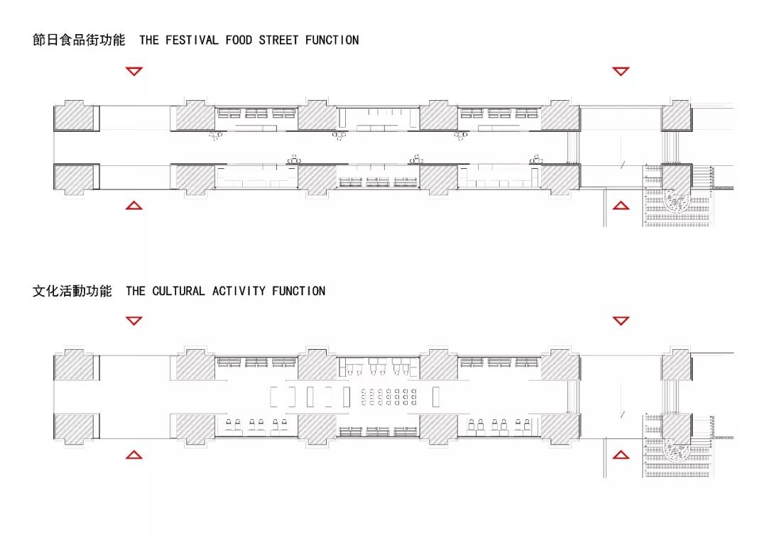 為了讓這座橋發揮其更大的商業功能優勢,設計師在內部功能設置上做了全新的分配,以中心步道貫穿兩側對稱的橋洞,呈現出了多功能空間系統,如:常態休閑功能、節日美食街功能、文化活動功能等。