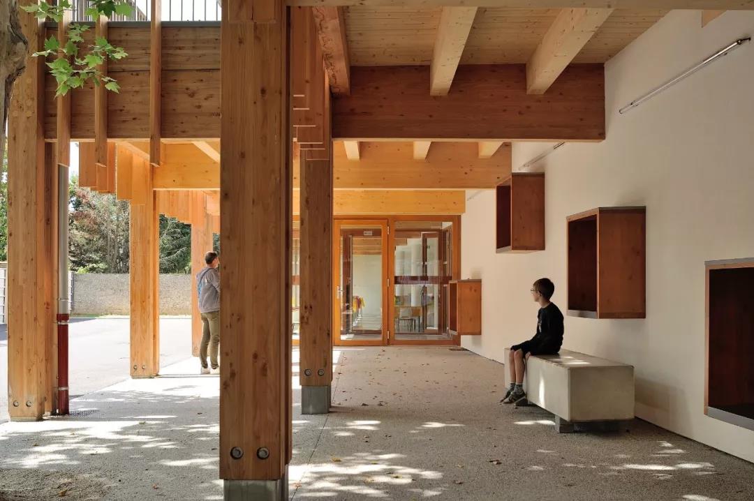 在院落一側,單層的木結構背靠夯土結構,提供了首層的有頂空間和二層平臺額外的戶外場地,在這里兒童可以在教師的陪同和監督進行各種教育活動。這也有助于緩解兒童休息時間里院落內的擁擠狀況。在兩棵懸鈴木的位置,建筑變形以避讓根系,同時又延伸入樹冠之下以享受樹蔭。建筑應用當地的實木,結構原則簡明,構件相互堆放,并置,疊加,如同兒童的搭建游戲,東側立面的豎向木構件發揮著遮陽板的作用。