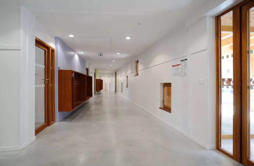 當地的傳統鄉土建筑是由夯土建造而成。沿著死路一側,現在已經被拆除的外墻面就是用這種當地材料建造的。學校組團可追溯至19世紀,為石造建筑,與市政廳隔街相望。新的幼兒園輕柔的嵌入夯土磚墻和懸鈴木之間,融入現存的密集城市肌理。