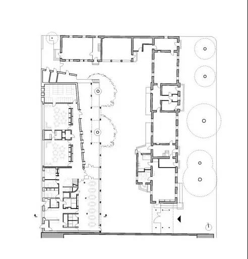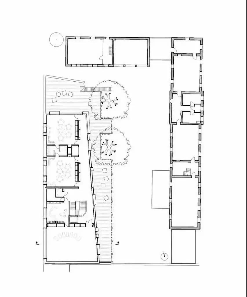 幼兒園輕微偏斜避讓院落中的懸鈴木。沿死路一側建造的夯土墻形成建筑的基座,墻體利用了現場的粘土和黃土資源,與古老墻體的材料建立對話。
