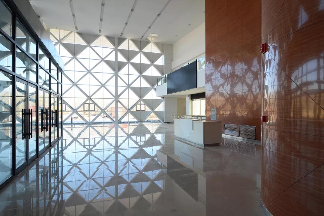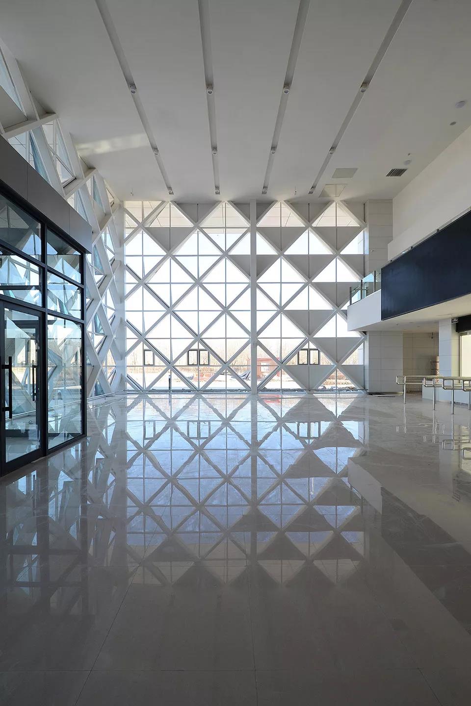建筑設計團隊在本項目中進行了室內公共空間設計,強調了室內外空間設計的整體性和互動性。建筑外部的三角幕墻表皮成為外立面的特征,也形成了室內空間的主要界面元素。在二層樓板、屋面吊頂的形式處理上強化建筑形體的曲線關系,與外部形體相互一致,同時進行室內外的空間關系互動。