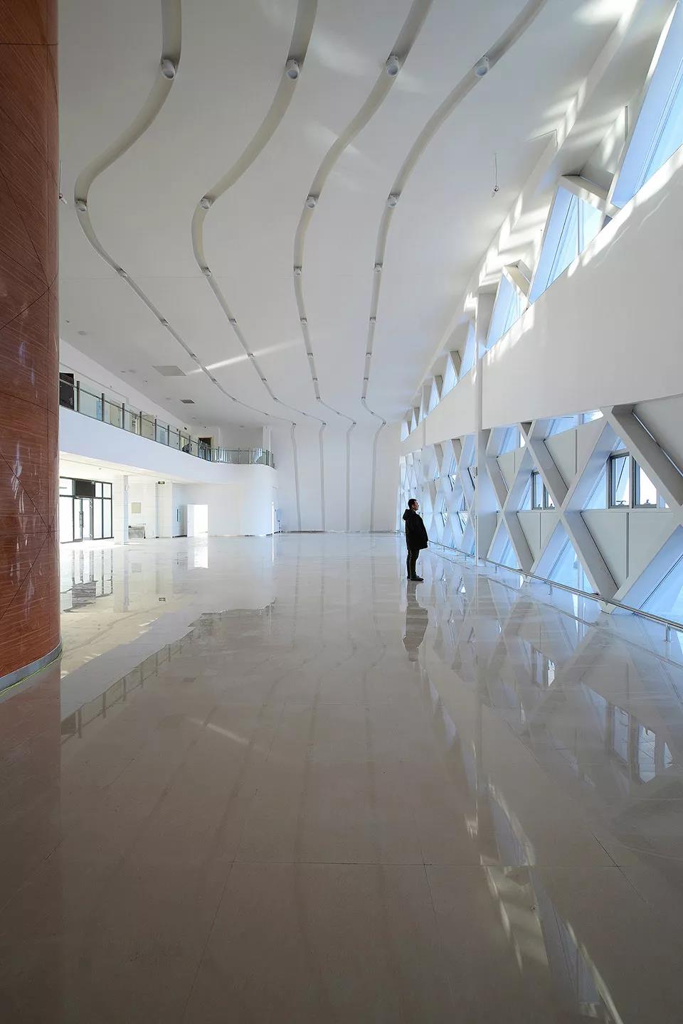 室內天棚與樓板的簡約曲面與復雜的建筑幕墻形成虛實對比,在形體語言和色彩上融合在一起。共享大廳的中部連接區采取了仿木紋鋁板墻體的設置,活躍內部空間色彩并區分兩部分主體功能空間。