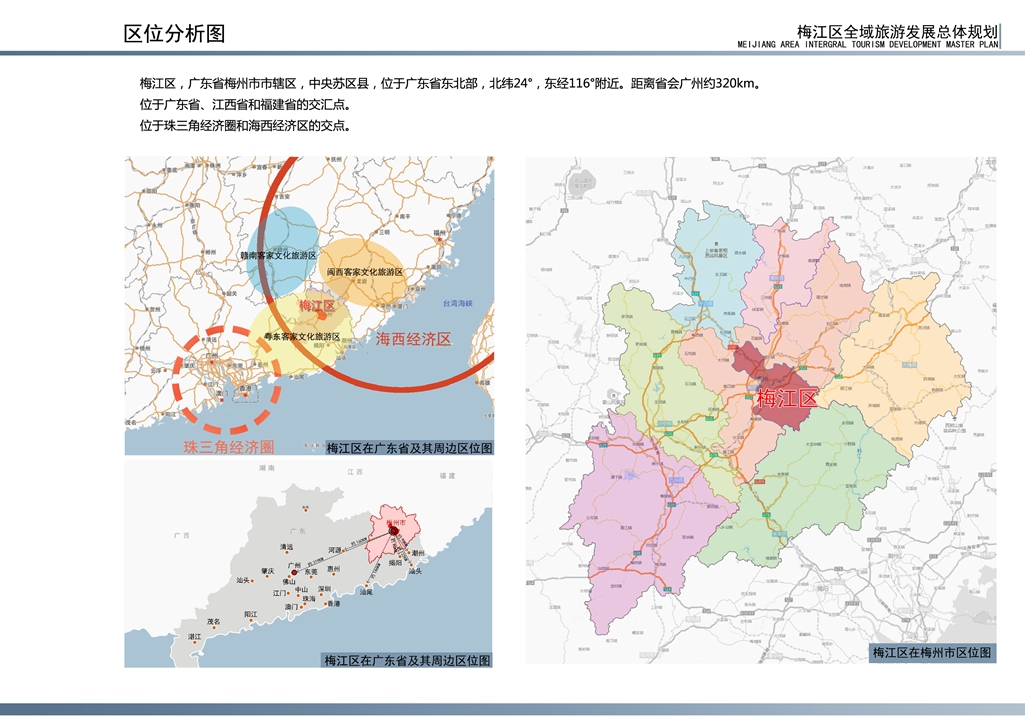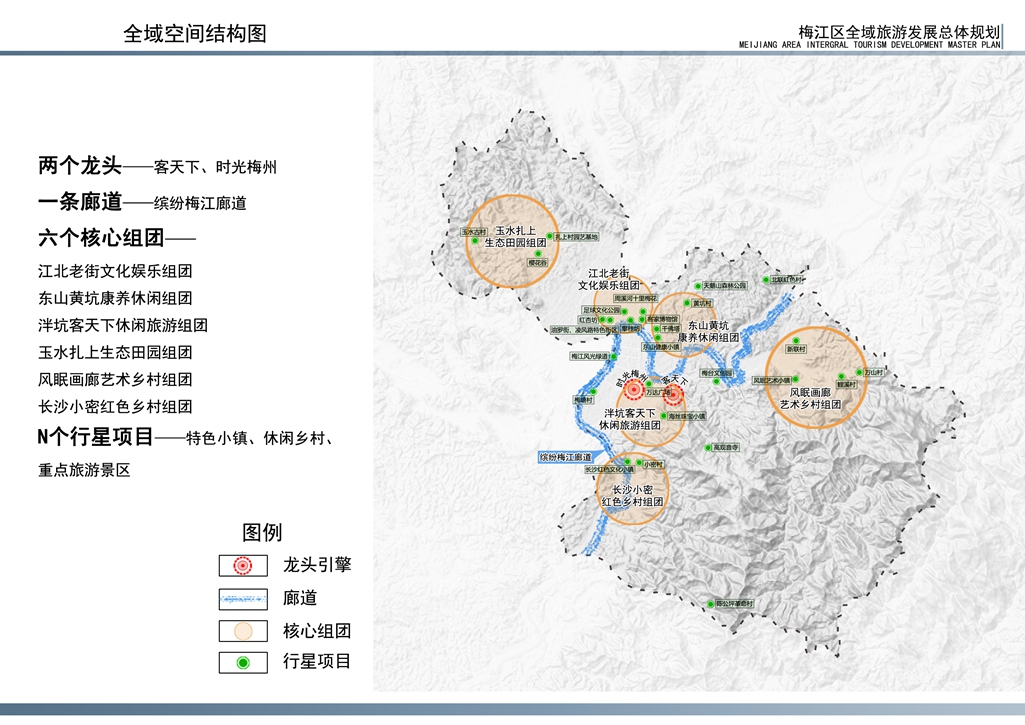 總體定位:客都創意休閑旅游目的地梅江區以創建廣東省全域旅游示范區為契機,以旅游發展推動梅江區產業升級,發展多元化旅游產品體系服務功能,將梅江區建設成為集現代客家文化娛樂、創意生活體驗、山水田園、康養度假、鄉村民俗休閑等功能為一體的國際知名客都創意休閑旅游目的地。