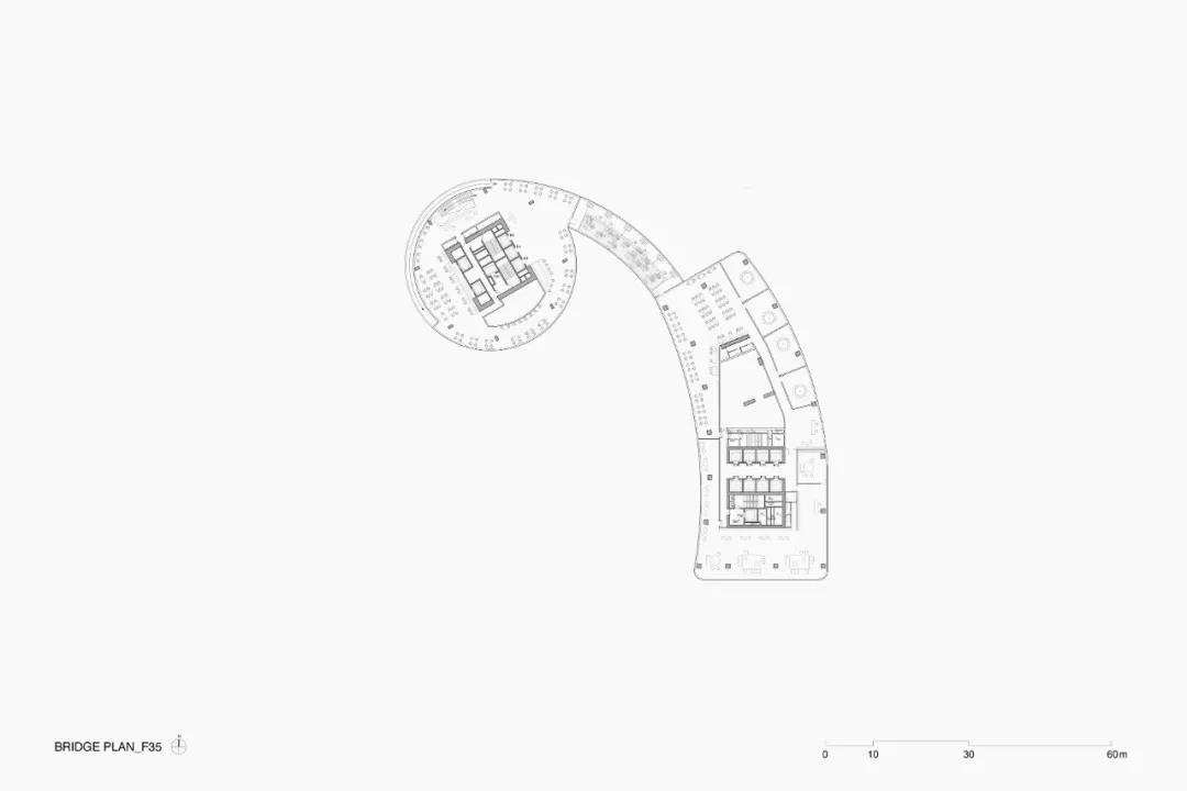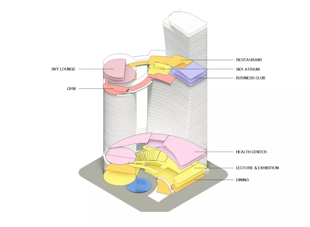A座是一棟150米高的住宅塔樓,為居住板塊;B座則是200米高的寫字樓,設有辦公室、實驗室和公共接待處,是工作板塊。四座綠色橋梁像碳鍵一樣連接著兩座塔樓,兩座上層橋梁是健康空間,是大廈的營養健康模塊,其中有咖啡館、健身房和游泳池。兩座較低的橋梁連接形成公共宣傳空間,包含診所、展廳及會議空間。碳云診所是圍繞生活和工作塔的核心元素,支持碳云將醫療科學應用于日常生活的使命。
