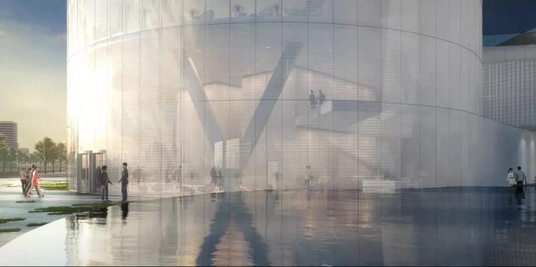 建筑立面具有不同透明度的多孔玻璃幕墻,為建筑提供量身定制的采光條件。曲線幾何形狀塑造帶有水上花園和配備水循環系統的“知識庫”地面公共空間。公共空間部分嵌入地下,水池中不斷循環的水聲掩蓋了城市的聲音,營造一個不被打擾的幽靜空間。