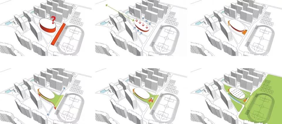設(shè)計(jì)將重點(diǎn)定位在:量身訂制一座體育館–不對(duì)宿舍樓造成過(guò)于壓抑的影響,能成為整個(gè)校園的重要軸線收尾,并且能提供流線與造型均流暢便利的共享平臺(tái),打造一座活力無(wú)限的校園魅力中心。