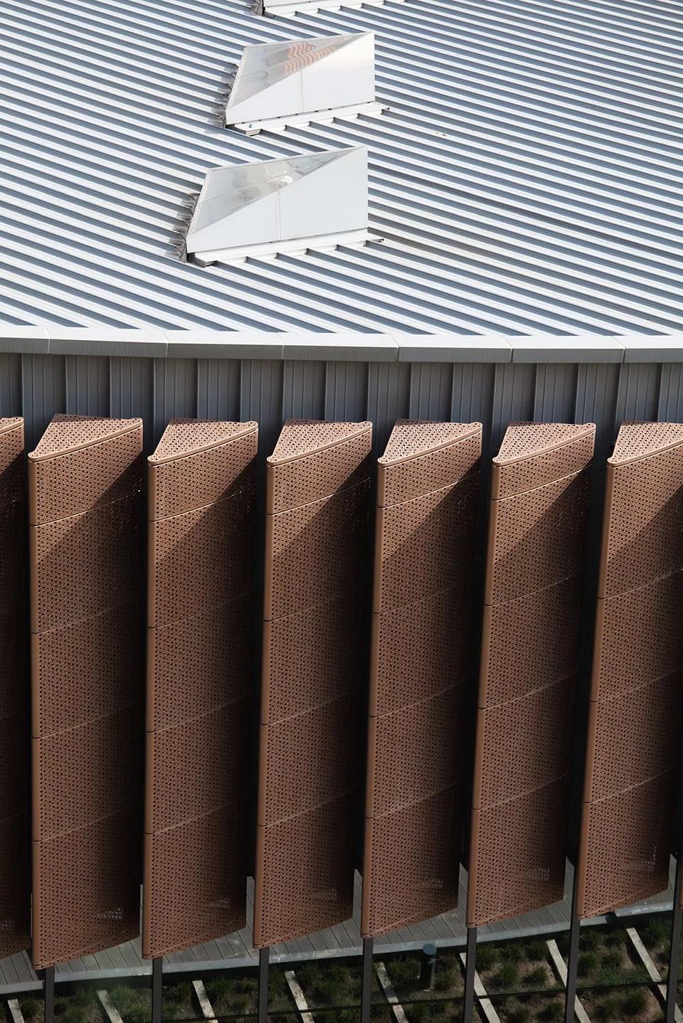 顏色采用富有活力的橙色與對(duì)比強(qiáng)烈的混凝土白色進(jìn)行對(duì)比,突出輕盈的流線形平臺(tái)板帶;再配合顏色優(yōu)雅的珠光咖啡色穿孔板裝飾折板與藍(lán)灰色的玻璃,襯托出優(yōu)雅大氣的主館建筑,整體層次豐富,給人以視覺(jué)的沖擊與美的盛宴。
