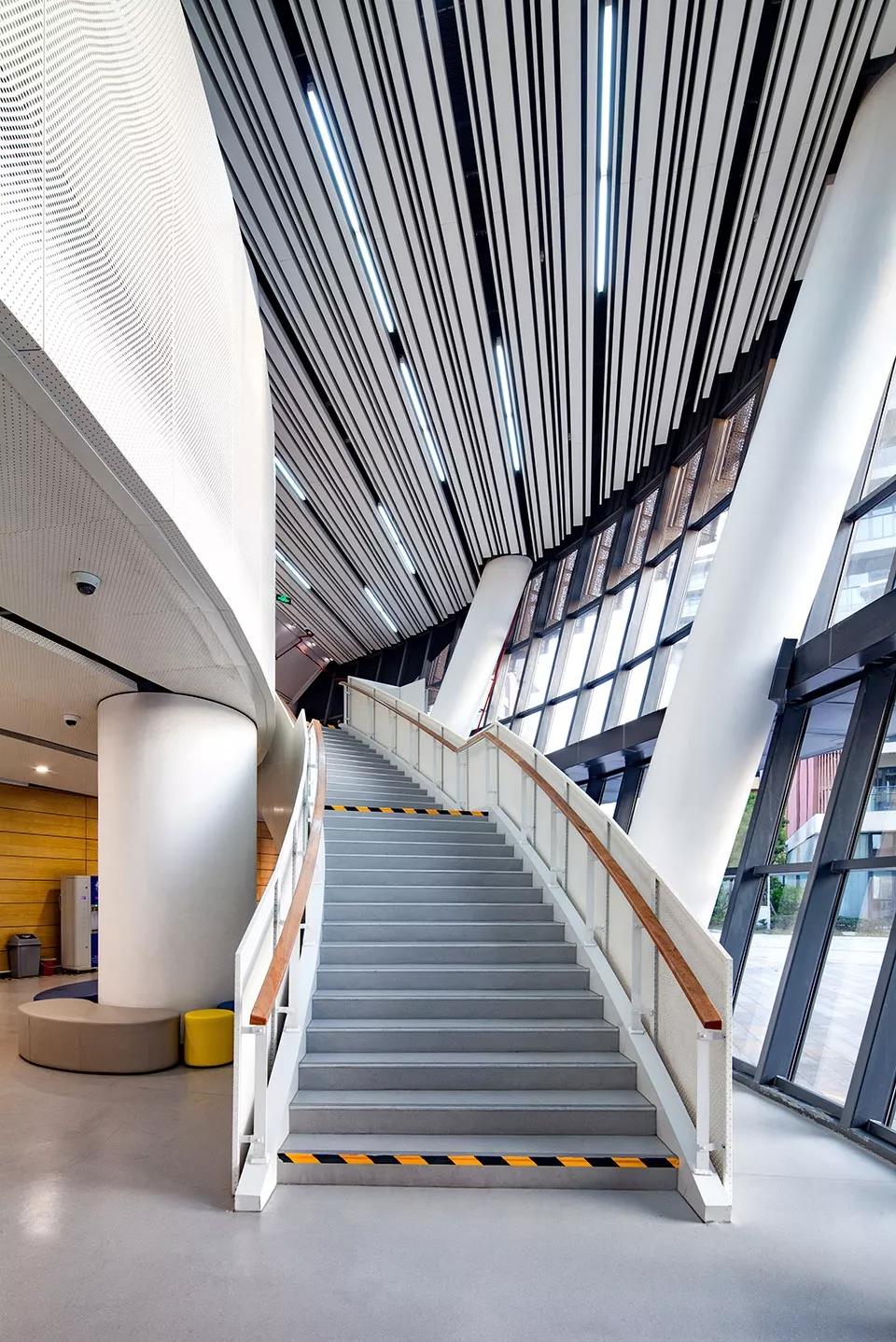 考慮到從校園不同角度的觀賞需求,立面裝飾材料主要采用玻璃幕墻、穿孔鋁板、埃特板與清水混凝土。其中穿孔鋁板構(gòu)圖采用優(yōu)美舒緩的波浪形,在入口處上翻,增加玻璃幕墻的比例,加強(qiáng)主入口的吸引力與引導(dǎo)里,而兩側(cè)坡道下方采用木色埃特板,打造富有親和力的基座。