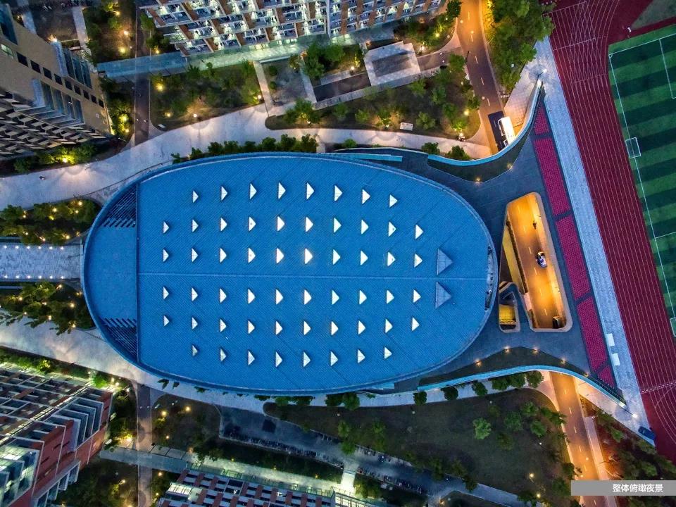 屋頂?shù)奶齑案紤]結(jié)合結(jié)構(gòu)的菱形拉索形成的三角空間,設(shè)計(jì)成斜向的三角形天窗,從而在引入自然光線的同時(shí),也為屋頂增加了富有趣味與韻律的點(diǎn)綴。到了夜晚,從三角天窗透出的亮光,更是點(diǎn)燃了整個(gè)校園的******與活力,成為校園中最吸引眼球的璀璨建筑。