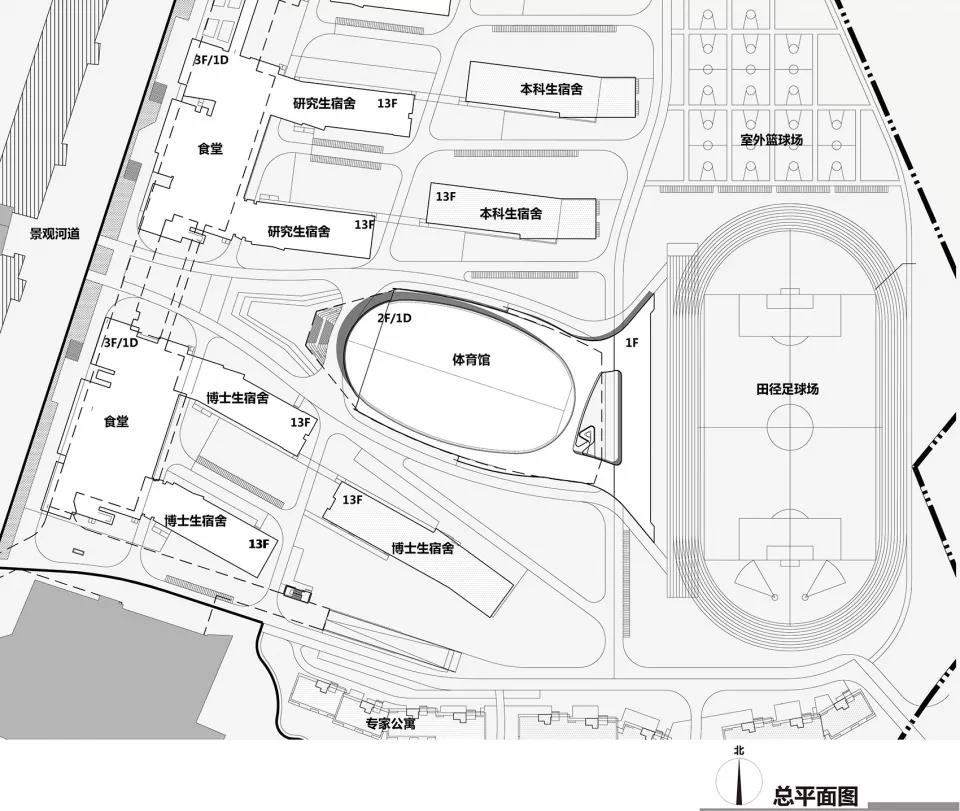 限制——根據(jù)規(guī)劃,體育館坐落于科技大學(xué)東片的師生生活區(qū)內(nèi),南北兩側(cè)均為高層學(xué)生宿舍樓,間距僅100m,兼顧日照等因素,對(duì)體育館體量來(lái)說(shuō)較為緊張。