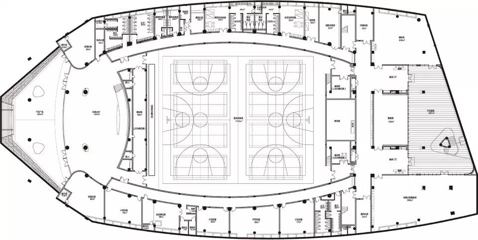 體育館主場(chǎng)館—籃球館,就位于建筑的橢圓形體量?jī)?nèi),從+-0.000m開(kāi)始通高至屋頂,場(chǎng)地南北長(zhǎng)46m,東西寬34m,平時(shí)可布置2片籃球場(chǎng)地,籃球館屋頂為斜面,最低點(diǎn)凈高15m。