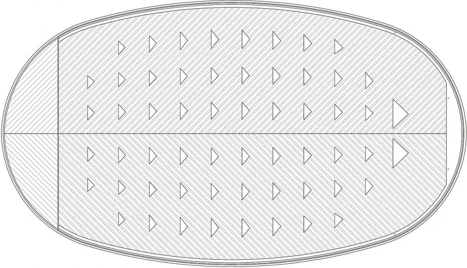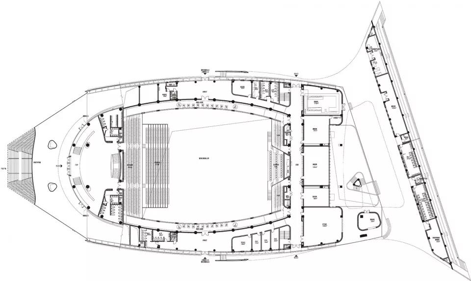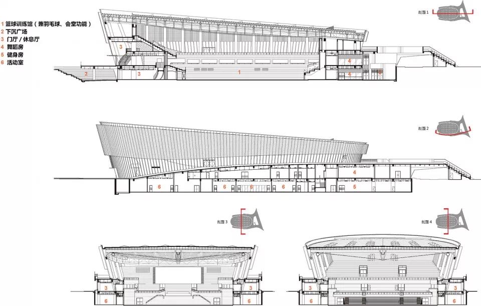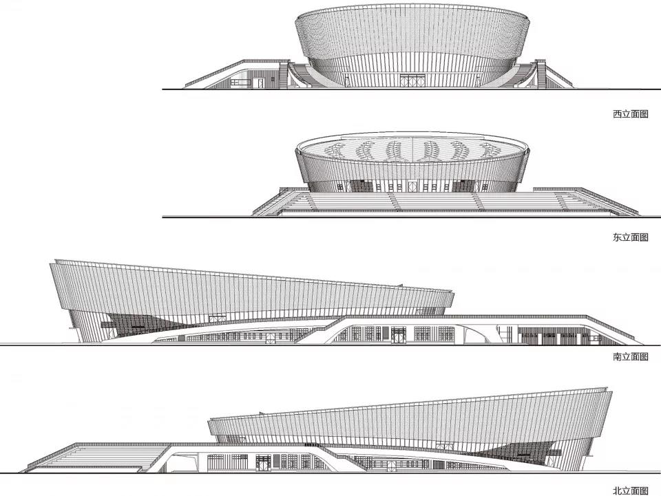 為了能在緊張的南北寬度限制中,盡量減少對(duì)兩側(cè)宿舍樓的壓迫感,因此建筑地埋一層,削減建筑高度;而坐席也采用東西長(zhǎng)向布置,并著重布置在西側(cè),增加樓座,如此既可以不占用南北寬度,又可以增加坐席數(shù)量,同時(shí)抬高西側(cè)高度,使建筑造型表里一致,契合功能需求的同時(shí),巧妙的打造出西高東低的雙心橢圓形斜屋面,從而對(duì)西向軸線形成重要的對(duì)景立面。橢圓形體量下小上大,減少地面的占地,盡可能多得留給室外活動(dòng)場(chǎng)所。