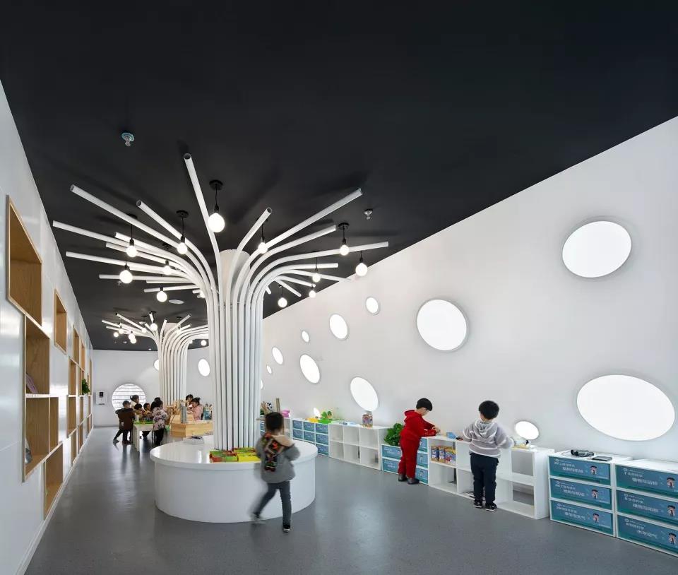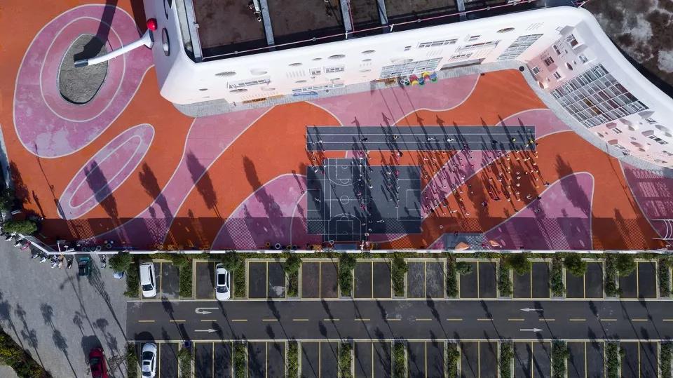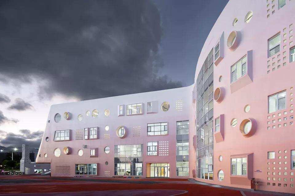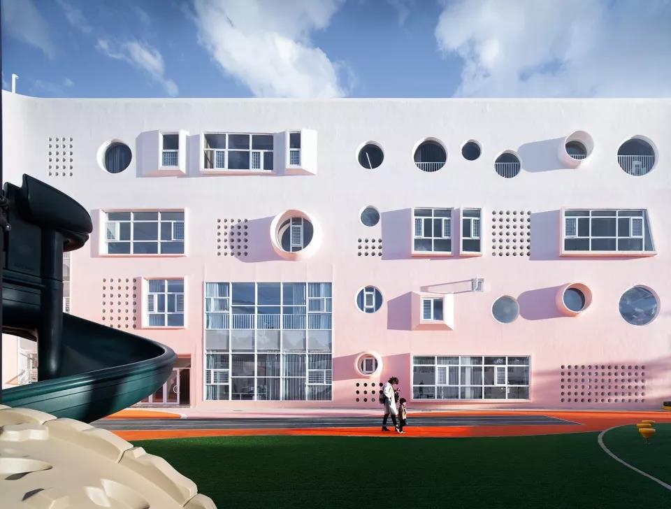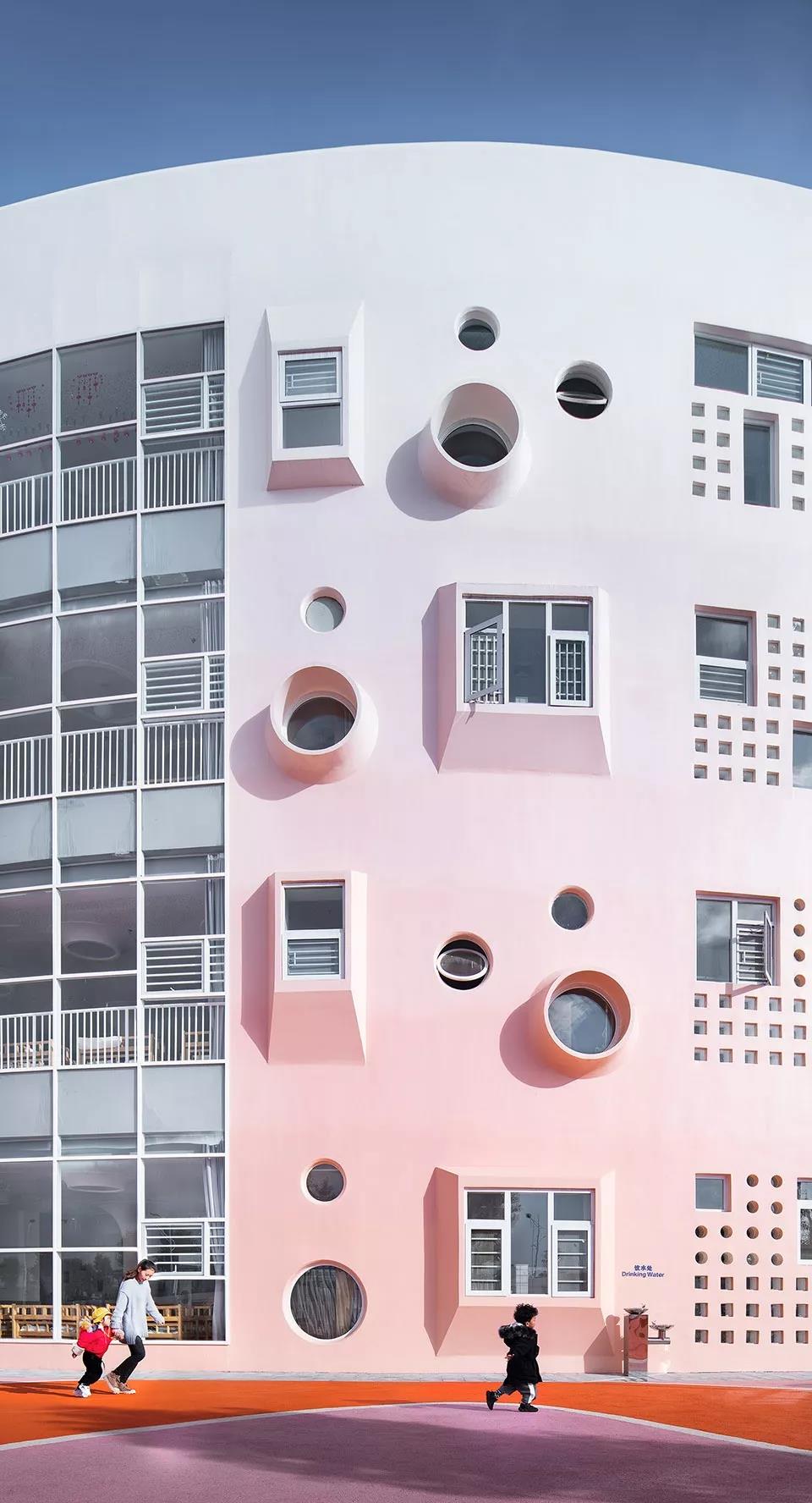 這個幼兒園與其他幼兒園最大的不同在于,他設計中所有的靈感均來自孩子的藝術世界,最突出的特點是外在造型上的設計,以“鑰匙”為載體,主體也以棒棒糖為造型,就像小朋友的畫作,加入更多順其自然與童真的幻想。