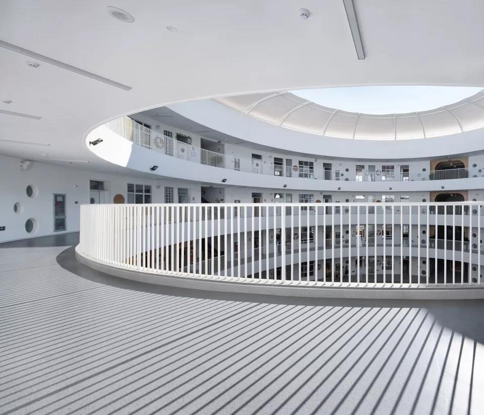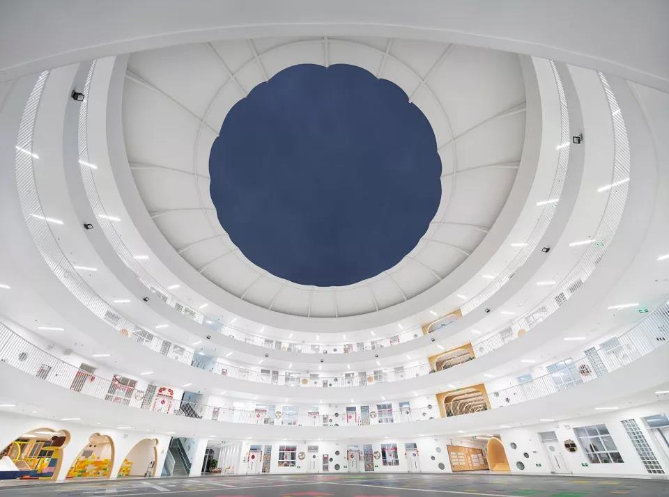 中庭空間增加了建筑的流暢感和流動性,內部空間以白色為主,地面則以彩色為主有活躍氣氛的作用,中庭空間是孩子們最主要的交往場所,圓環(huán)路徑,簡單,統(tǒng)一,孩子們可以在明亮流暢的中庭肆意奔跑,也能讓孩子們更自由自在的使用空間。