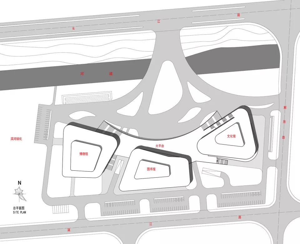 為了打造如東的文化風景線,強調(diào)文化中心的凝聚力和輻射力,博物館、圖書館、文化館三館相互咬合在一個大平臺上,將4層高的圖書館放置在中心位置,博物館和文化館3層高,放置在兩邊,三個場館形態(tài)上高低起伏,錯落有致,塑造豐富變化的城市建筑界面。