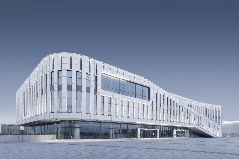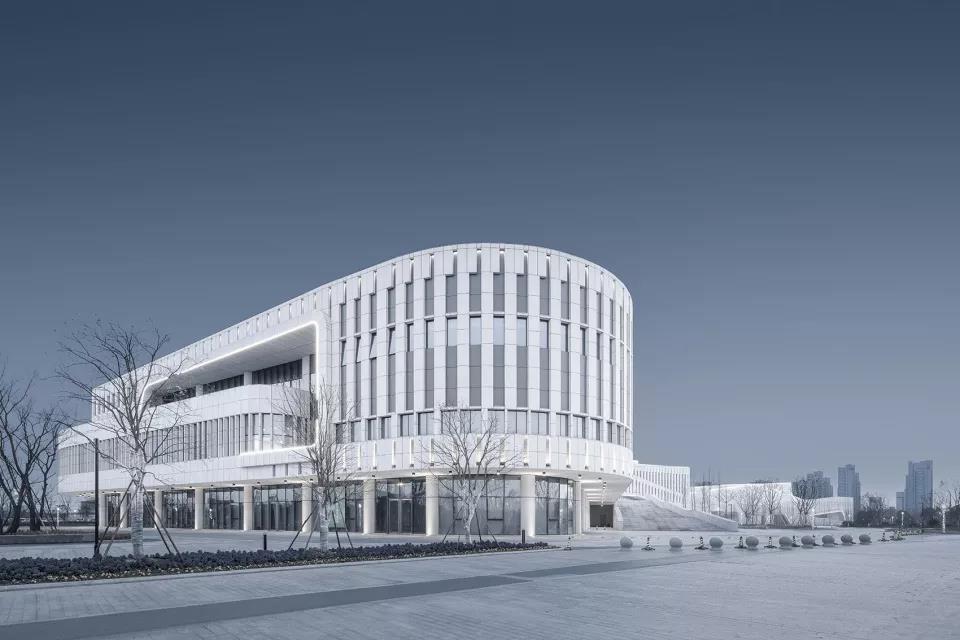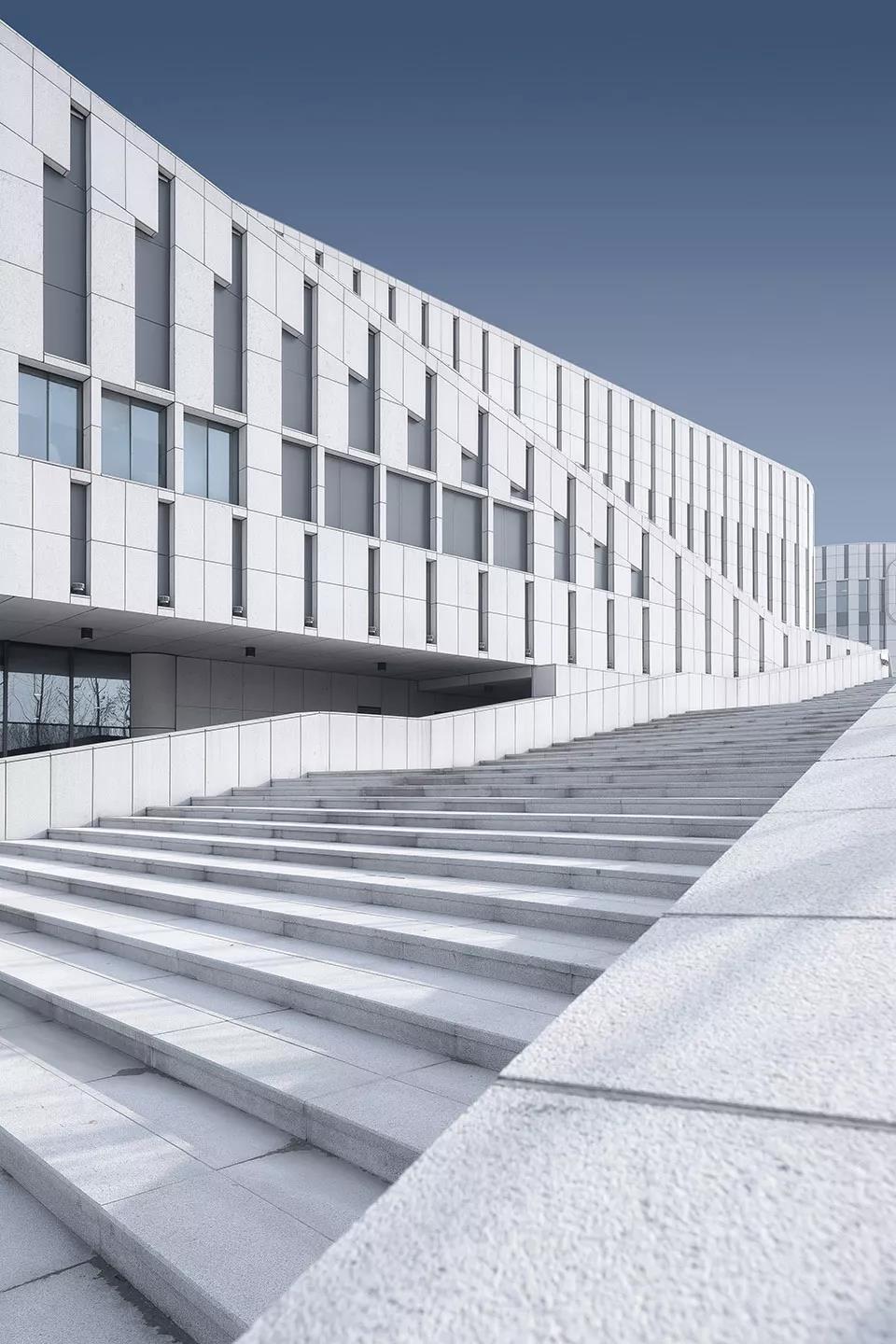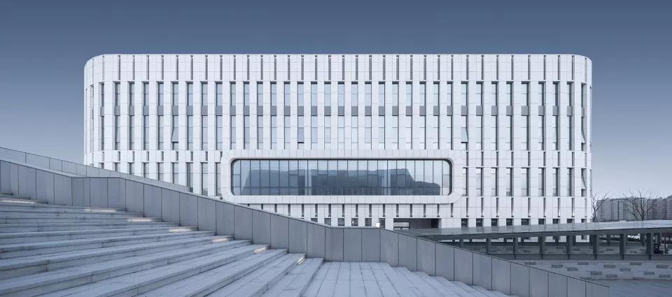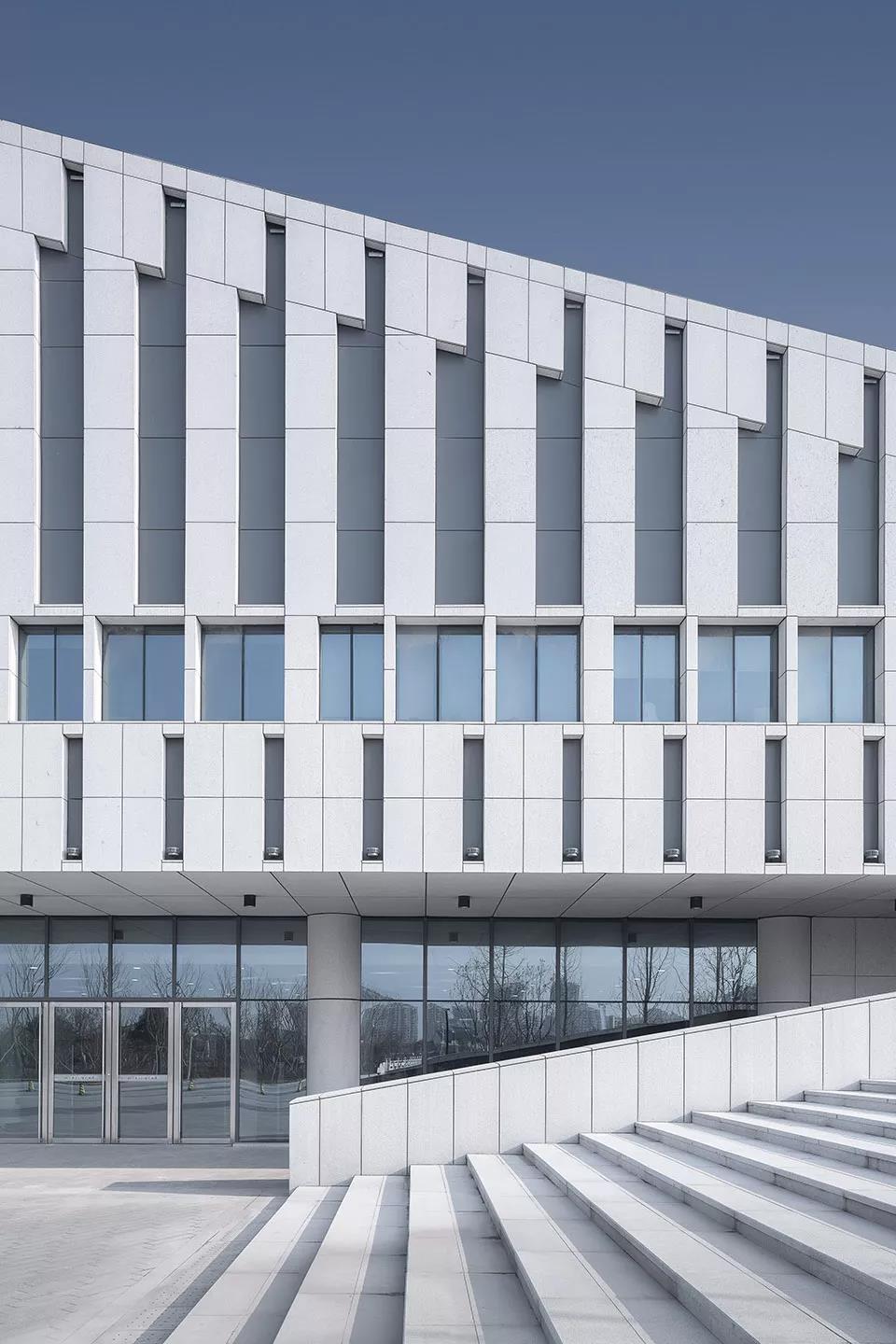 建筑外立面采用米******石材,強化建筑的體量感,以整潔有序的豎向開窗沿外表面鋪陳開來,保證圖書館、文化館讀書培訓等功能用房的采光和通風,并在層間采用疏密有致的豎縫進行縱向的變化.在入口和局部采用玻璃幕墻,取得良好的采光,實現(xiàn)與城市、河流的對話關(guān)系,玻璃與石材進行虛實對比,彰顯建筑的文化氣質(zhì)。