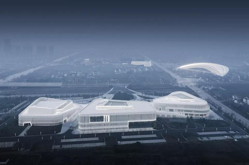 如東素有黃金海岸之稱,有煙波浩淼的南黃海,一望無際的沙灘,設(shè)計意在城市中構(gòu)建如東的未來“黃金海岸”,建筑形態(tài)上如黃海巨濤般拍打著岸邊礁石,呈現(xiàn)潮起潮落的建筑景觀,并積淀著如東的歷史、文化、科技和藝術(shù)和生活風貌,以優(yōu)美流暢的曲線和光華圓潤的建筑形體體現(xiàn)如東的漁鹽文化和民俗風情,實現(xiàn)建筑與城市,視覺和空間上的相互滲透。三個場館的建筑體量由中間的平臺緩緩升起,以臺階或者斜屋頂?shù)男问脚c平臺進行關(guān)聯(lián)和對話。