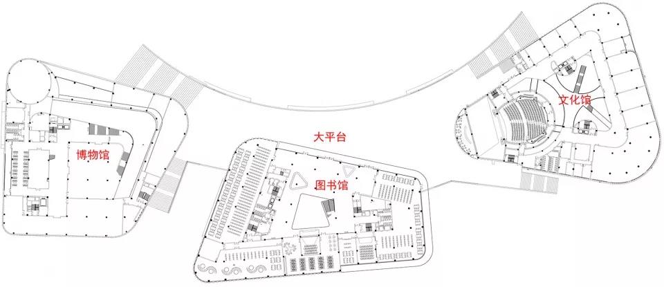 文化館、圖書館、博物館三館獨立運營,對內(nèi)通過采光中庭、開放閱覽空間、多主題的展覽空間、多元化的培訓用房、多功能劇場和報告廳等來營造市民交流與互動的文化氛圍,復合了展覽、觀演、培訓、親子、閱覽、休閑餐飲等功能,體現(xiàn)了文化的多元化和復合性。