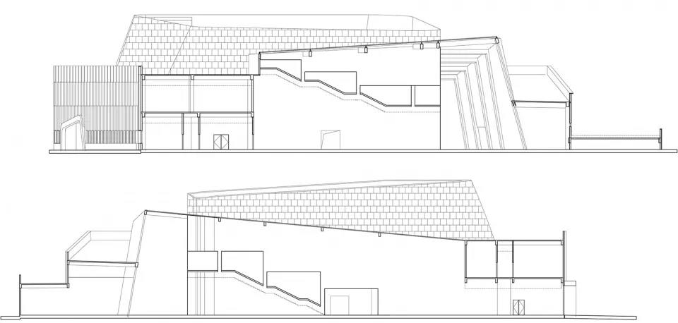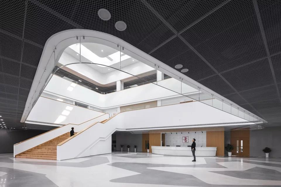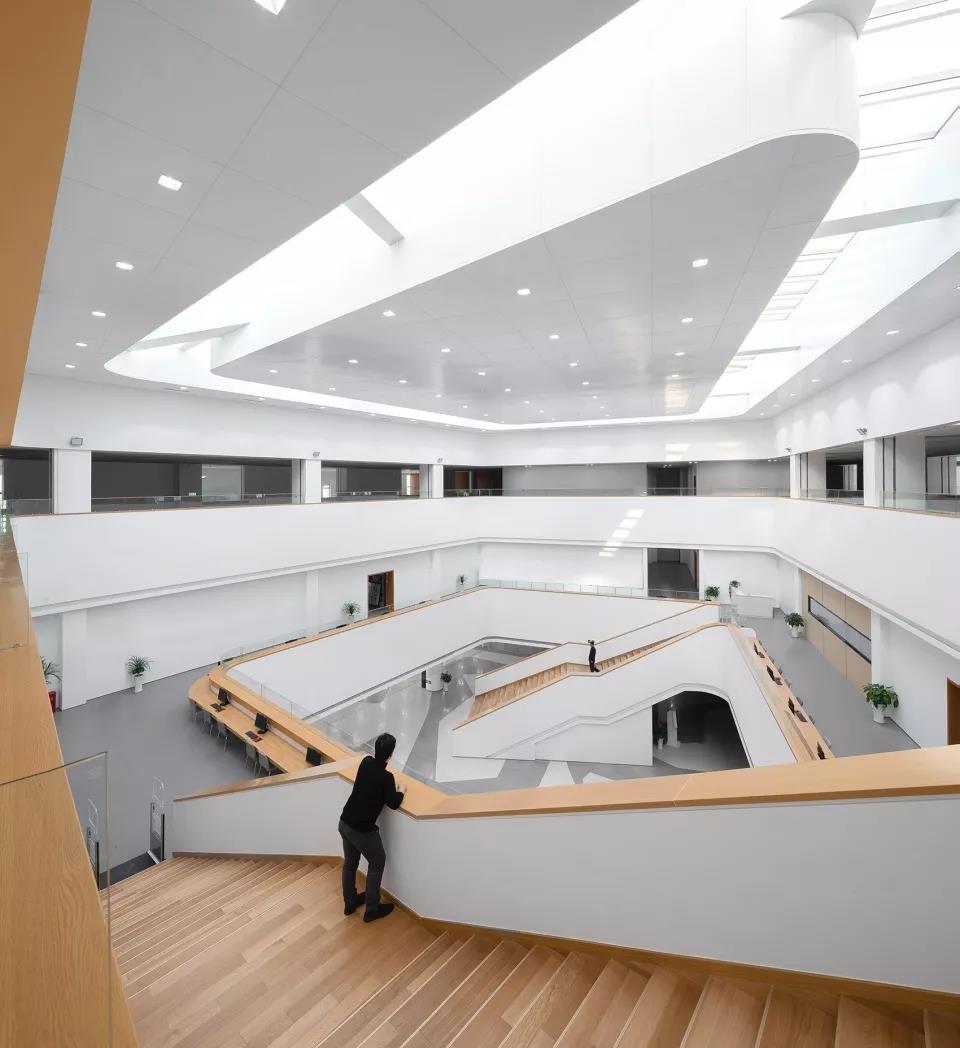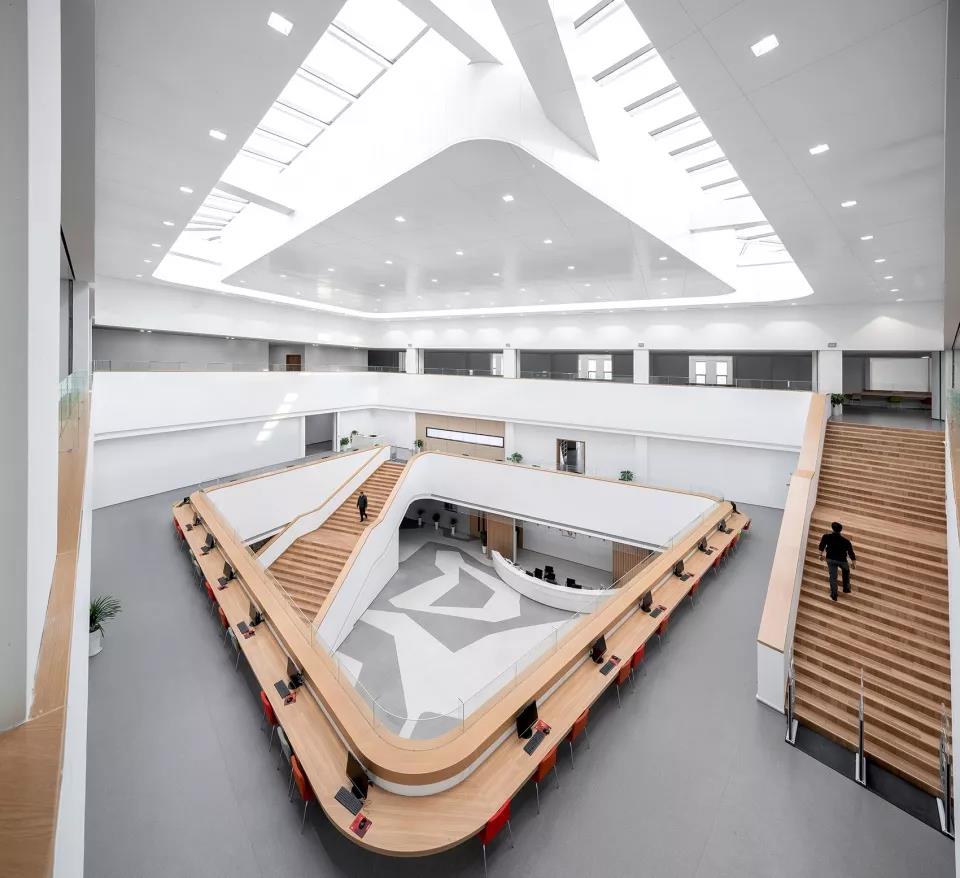 建筑圍繞著中間采光中庭展開,以兩個三角形的高低傾斜錯落穿插,塑造豐富的形態(tài),屋面也自然以臺階的形勢從大平臺逐級升起,將人流直接引向文化館的二、三層中庭。