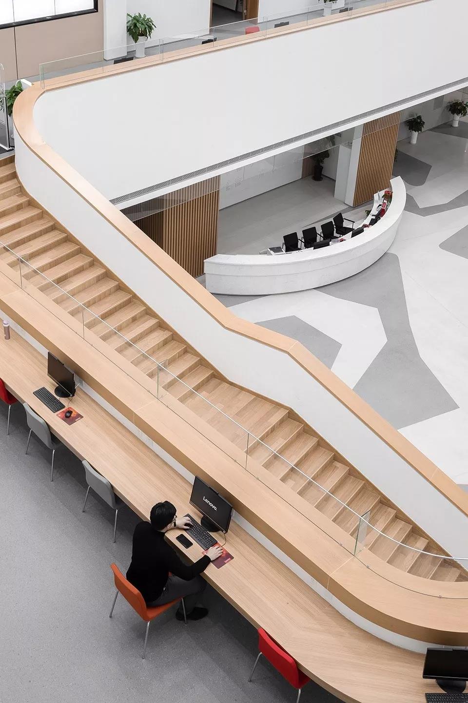 圖書館建筑面積28670平方米(包括地下停車場),共四層,主入口位于大平臺二層正中心,中央為讀者主要入口,設(shè)置讀者大廳、圖書外借咨詢臺、少兒閱覽室、多媒體閱覽室、期刊報刊閱覽室、視障盲人閱覽室,開架閱覽采用斜向上的階梯形式,向上升起的形體強調(diào)出下方的東南角入口;三層、四層各閱覽室及各功能房間緊密圍繞中庭展開,圍繞中央的退臺式開放閱覽空間旋轉(zhuǎn)、上升,閱覽室內(nèi)采用loft形式營造交流共享氛圍,通過多個層次的空間變化為讀者帶來多樣的閱讀環(huán)境體驗。書庫區(qū)和員工采編、辦公區(qū)域放置在4層東側(cè)區(qū)域。