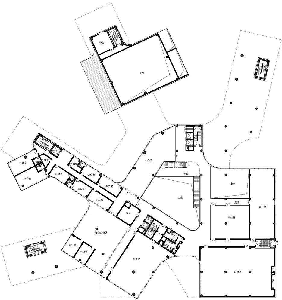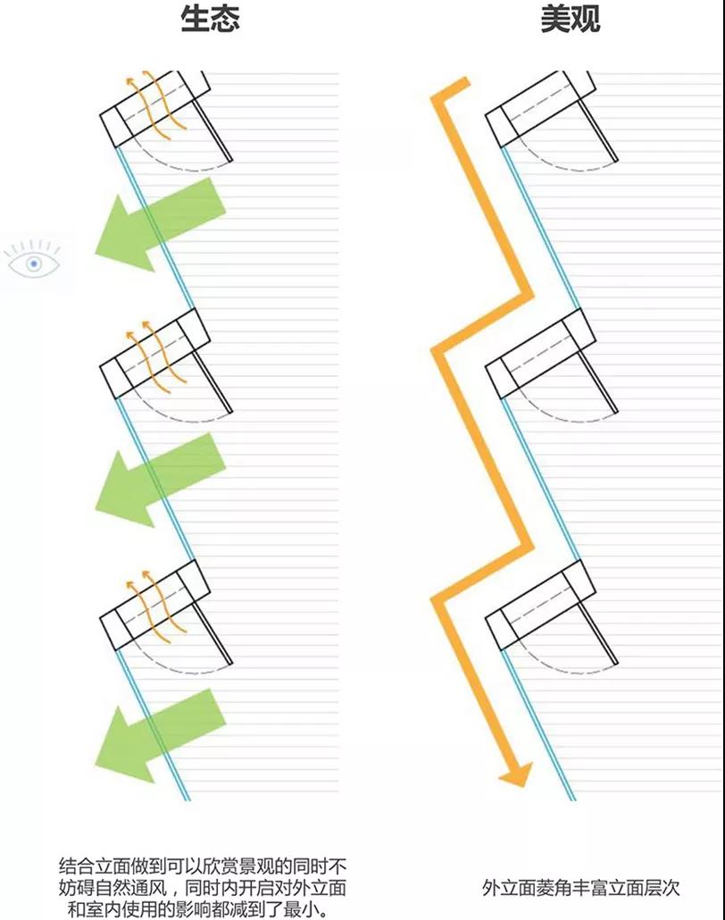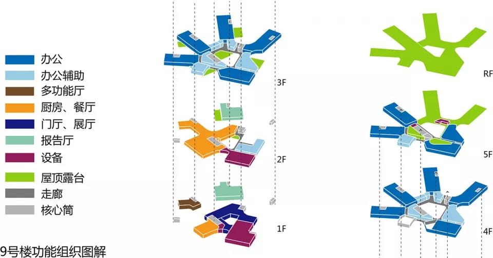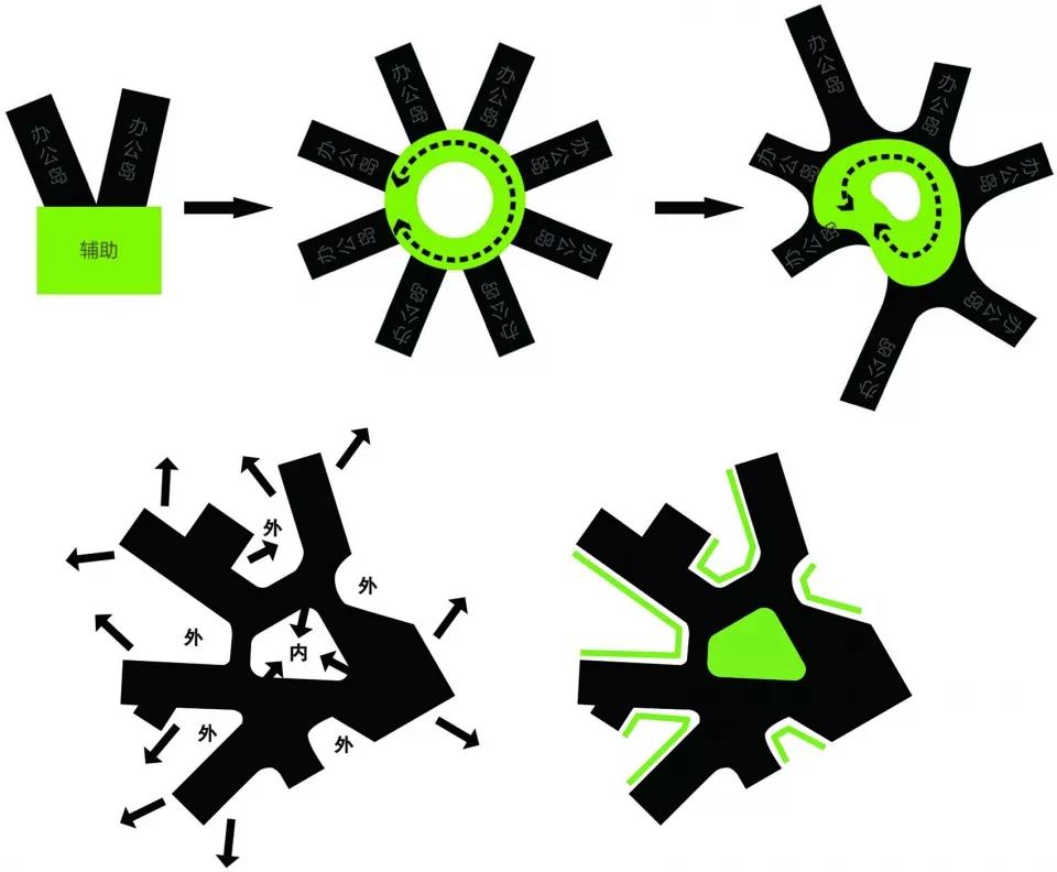 設計控制14米進深的“辦公島”為單元,設置內開啟扇,保證建筑良好的通風采光效果;各個與辦公相關的配套功能與垂直交通一并形成“活力核心”,串聯各個“辦公島”量體。