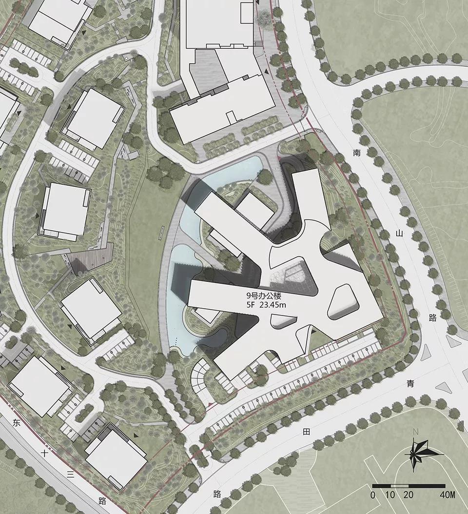 中集集裝箱總部辦公樓位于東莞市松山湖國家級高新開發區南部區,中集智谷西南部,緊臨松山湖及公共綠地,自然條件優越。地塊東側緊鄰南山路,南側靠近青田路,是城市道路的交叉口的重要空間節點。